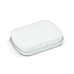 Contoured rectangular tin with a hinged lid filled with 14 grams of peppermints. Full ingredient and nutritional information is printed on the base of the tin. Decoration options: Pad Print | Direct Digital