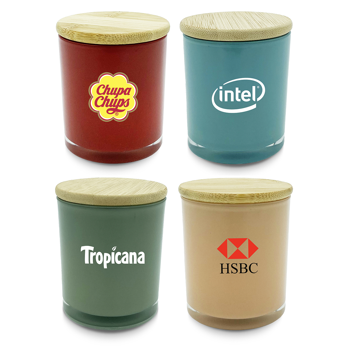 Give the gift of relaxation. These gorgeous vanilla-scented soothing personalised candles are crafted to provide ambient lighting and reduce stress. Designed with vibrant coloured frosted glass and a beautiful bamboo lid, you can do no wrong in choosing to brand with these candles, which are also available in all sizes to meet your brand's needs. With a burn time of 15- 33 hours these candles will transform the atmosphere in your home or office. Get in touch with us today to know more!. We can laser engrave however please note no two products will have the same outcome