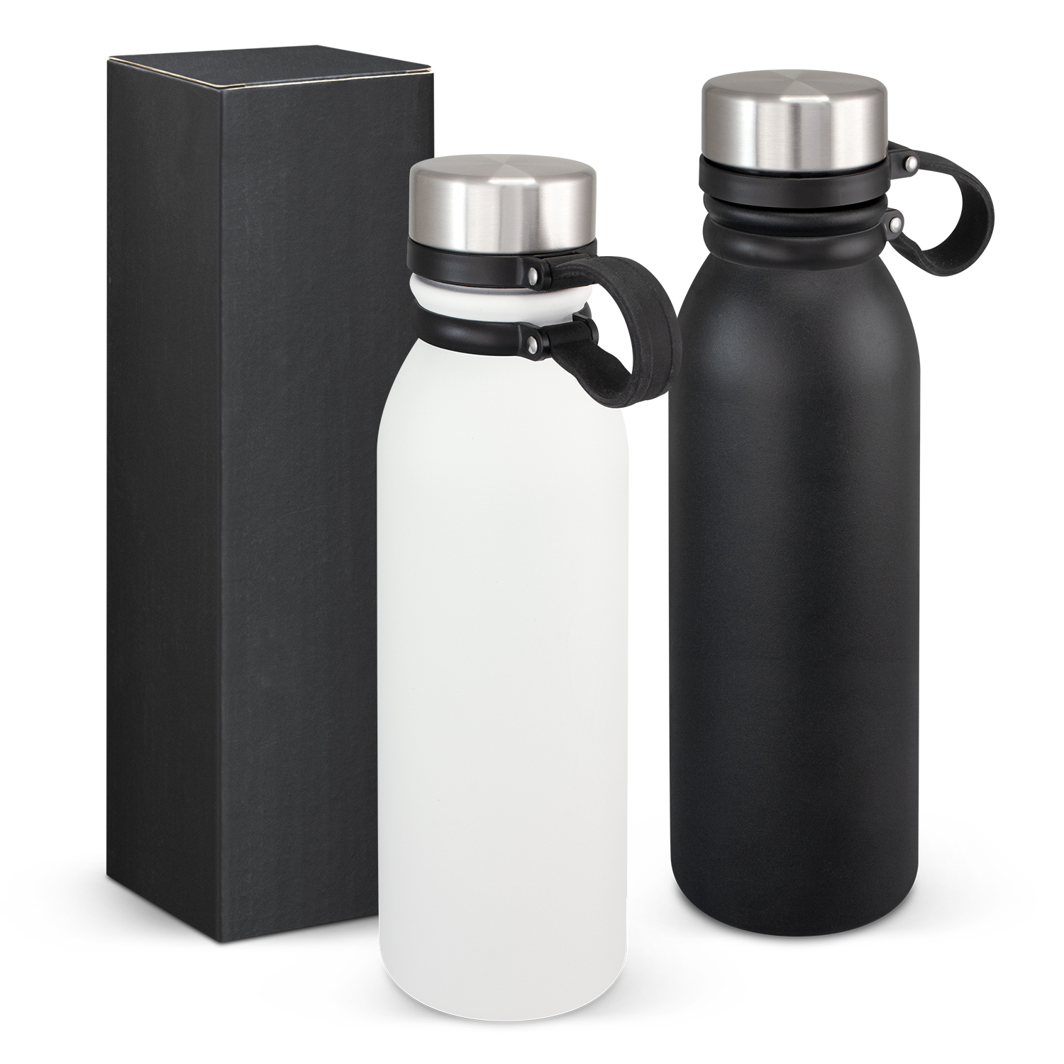 Robust 600ml, double wall vacuum insulated stainless steel drink bottle with a tough powder coated finish. It will keep drinks cold for 24 hours and hot for up to 12 hours. Renault has a secure screw on stainless steel lid which is attached to the bottle with a soft-touch silicone strap that doubles as a carry handle. The bottle is BPA-free and laser engraves to a shiny steel finish. It is presented in black gift box. This product is not dishwasher safe and handwashing is recommended.