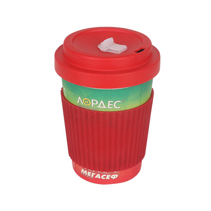 Reusable coffee cup has a 350ml capacity with a heat resistant silicon band and a clip on lid. It is manufactured from tough BPA free, food grade and dishwasher safe material. The cup's wall can be fully printed with any logos, and the silicon colour can be customized. It comes with a standard Opp bag and you can choose the optional standard paper package or customized package at extra cost.