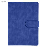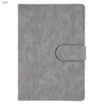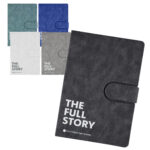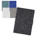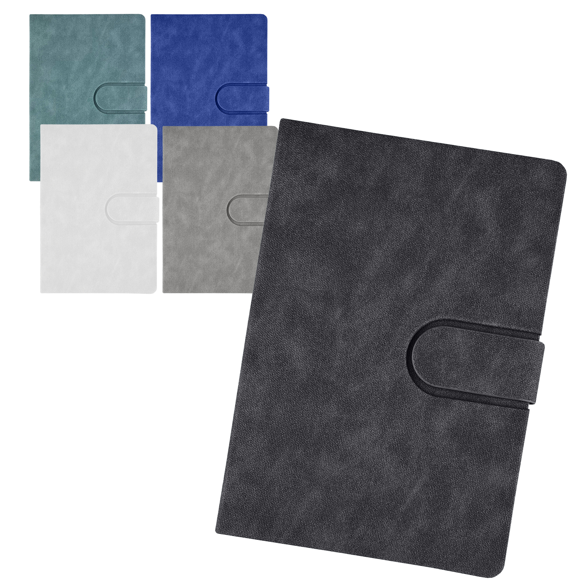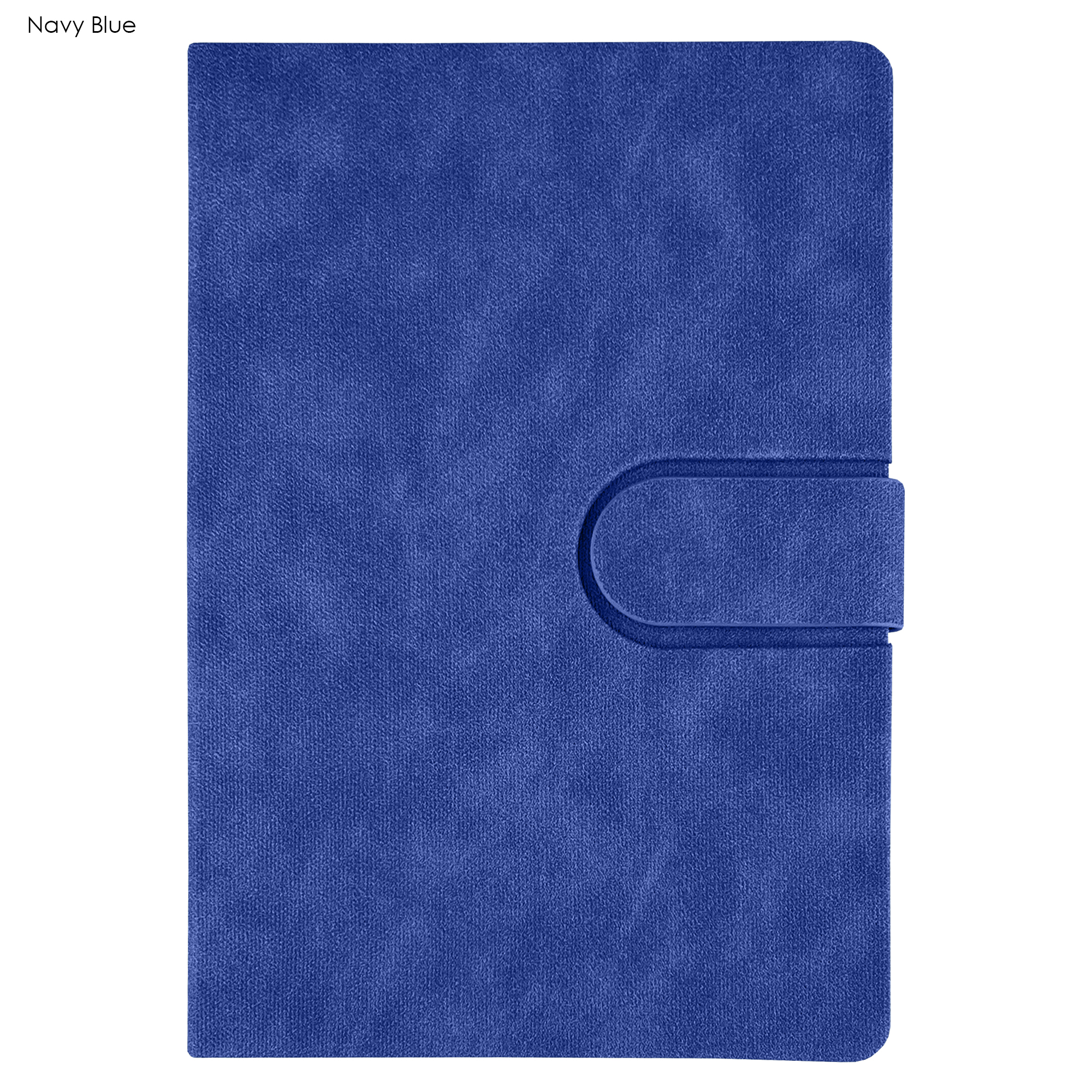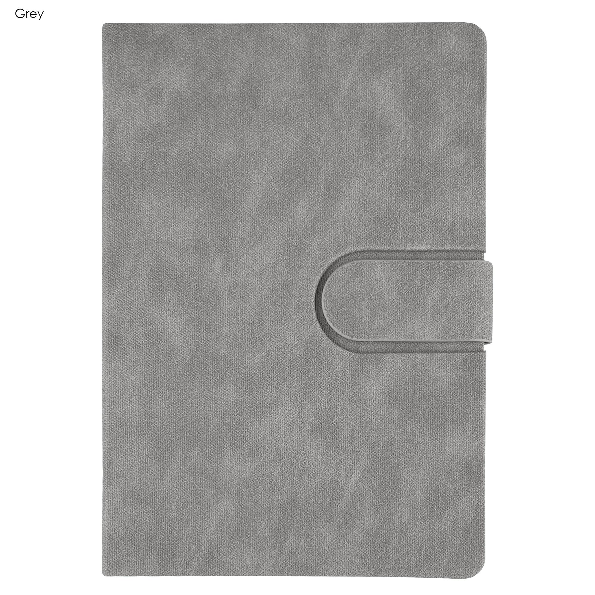 Modern design A5 notebook with hard PU leather cover with magnetic flip closure. 80 leaves (160 pages) of 80gsm lined off-white pages and matching colour fabric bookmark.