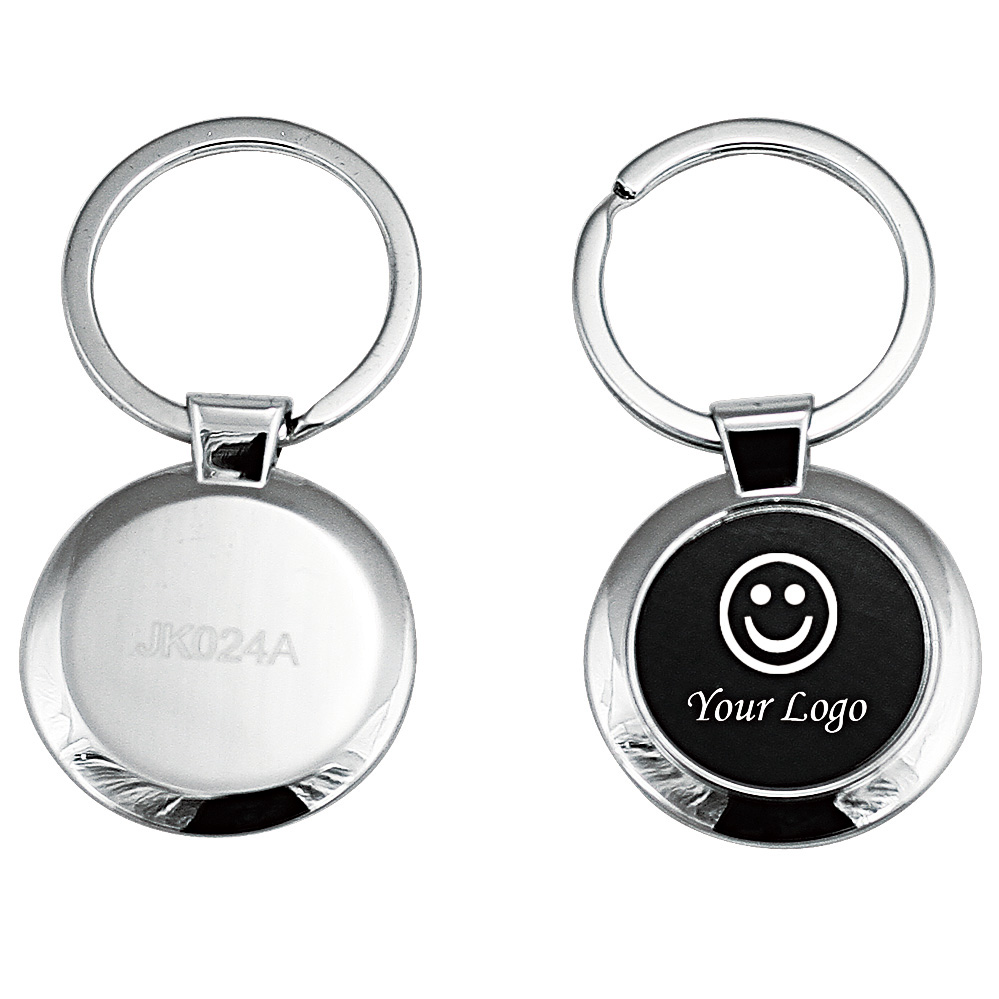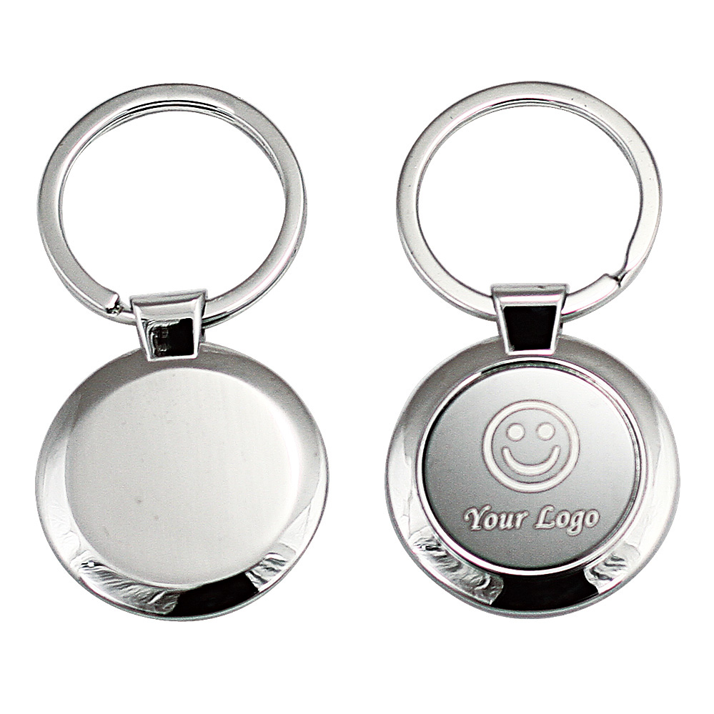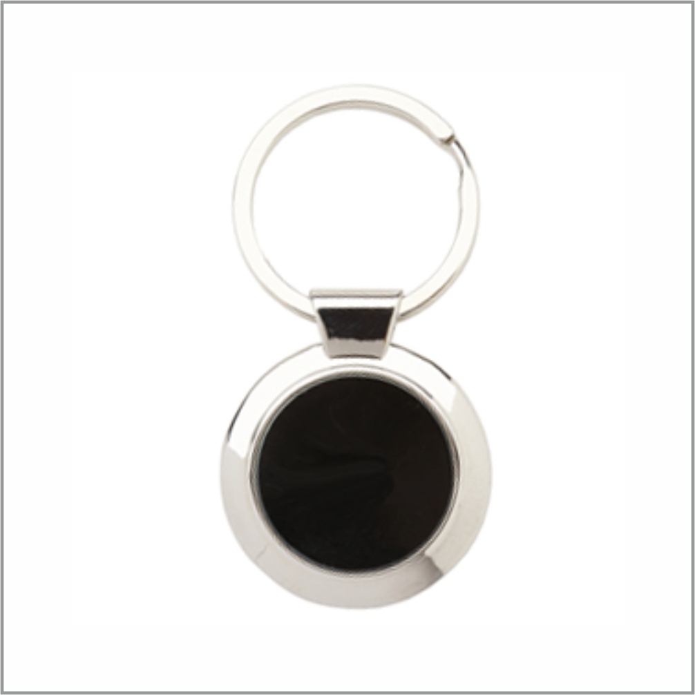 Metal key chain, body in shiny nickel with black aluminium plate or shiny black plate.