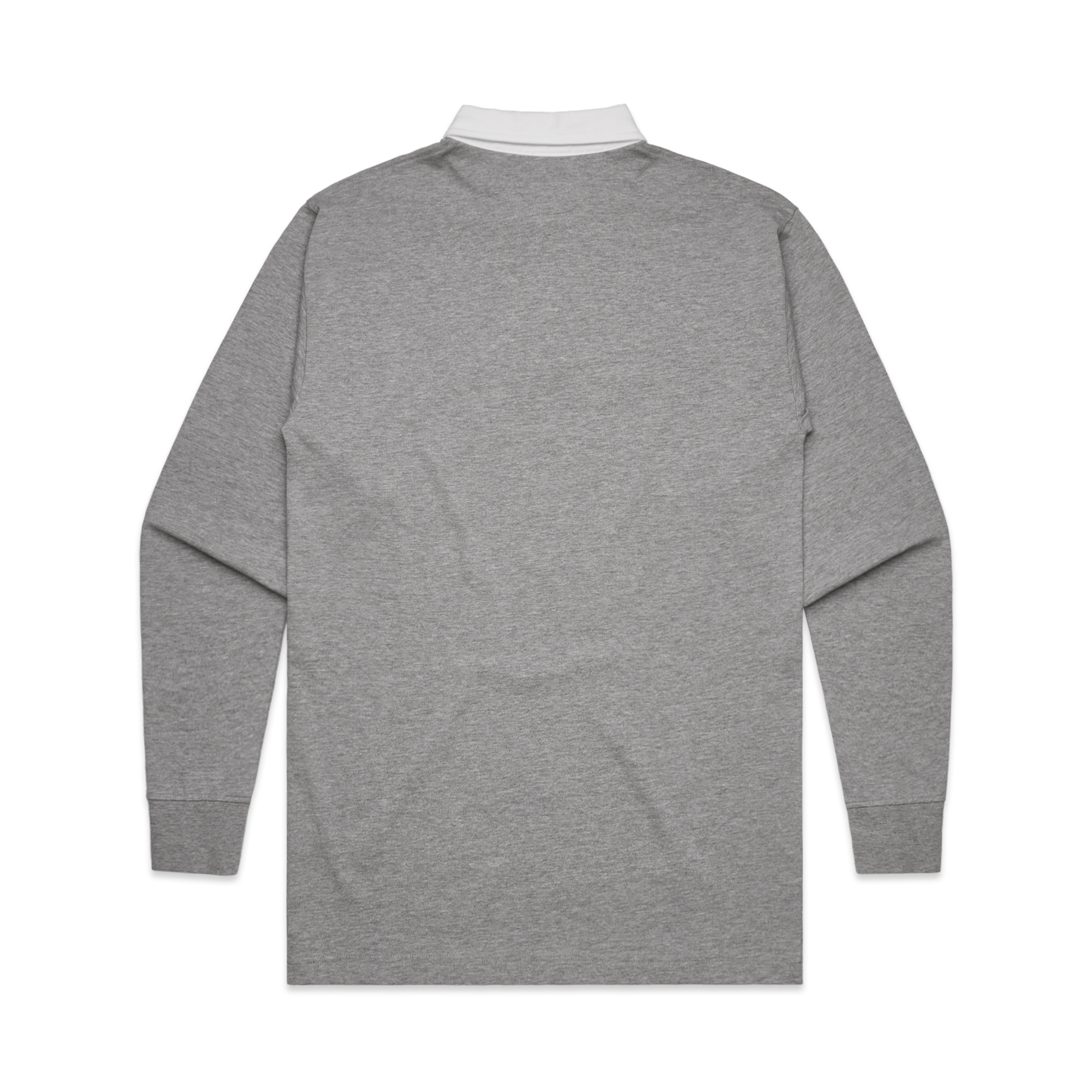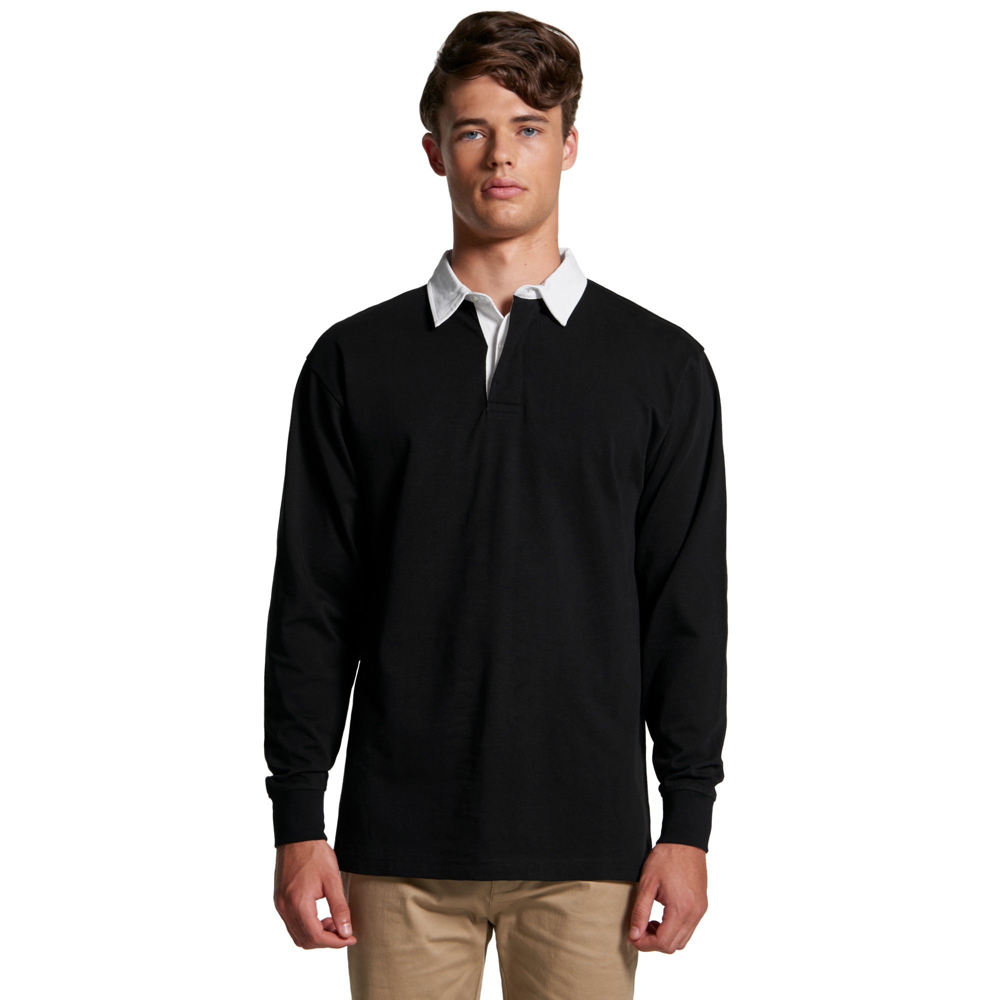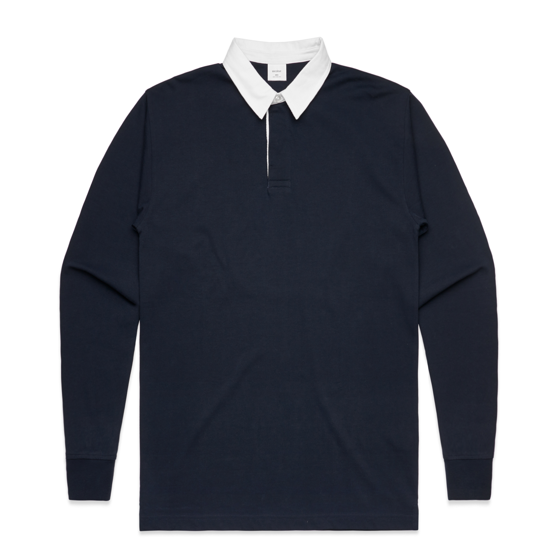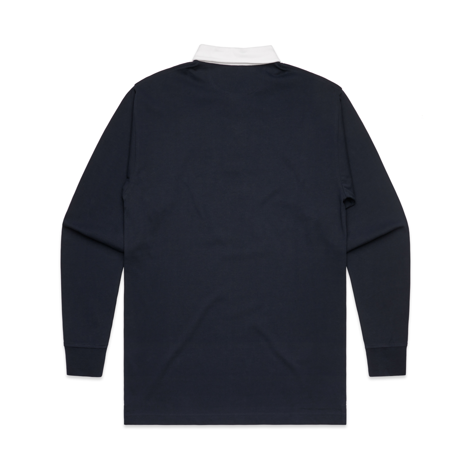 Men’s relaxed fit rugby top. Heavy weight, 280 GSM, 20-singles. 100% carded cotton (marles 15% polyester). White drill collar, herringbone tape at placket, ribbed cuffs, side split at hem, side seamed, double needle hems, preshrunk to minimise shrinkage