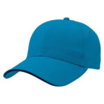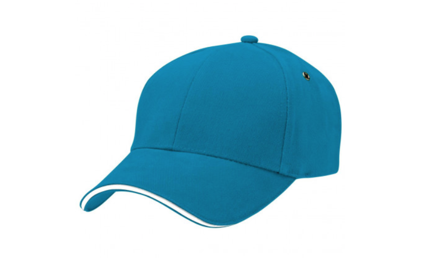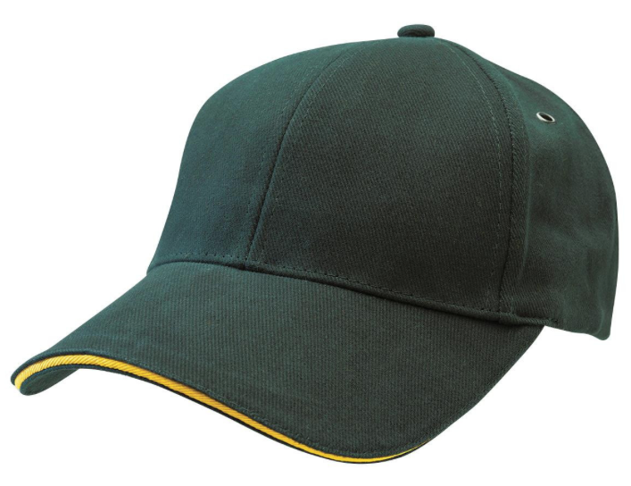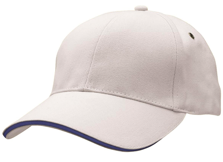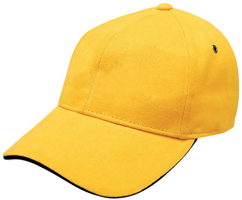 Subtle contrast in the sandwich peak sets this cap apart from the crowd. Heavy brushed cotton with contrast sandwich peak. Gunmetal eyelets. Structured 6 panel design. Padded cotton sweatband. Fabric strap with gunmetal buckle and tuck-in return. Pre-curved peak