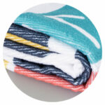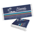 Large 140cm x 70cm beach towel with white or black tassels which is manufactured from fast drying 240gsm polyester. It can be branded on one side with stunning edge-to-edge spot colours or full colour print. A production lead time of 20 working days applies to this product by air freight and larger orders can be sea freighted on request to reduce the freight cost.