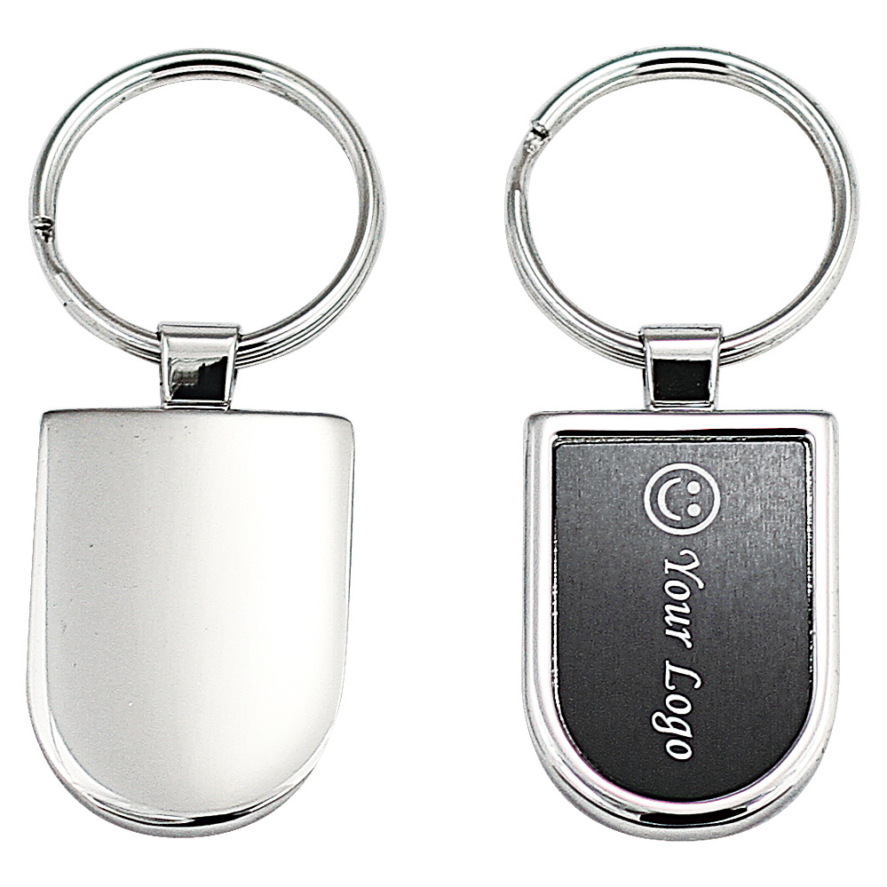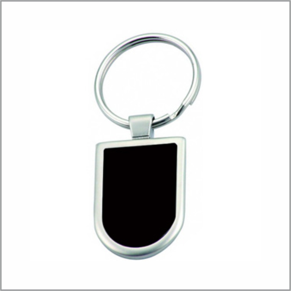 Metal key chain, body in shiny nickel with black aluminum plate or shiny black plate or rushed steel Plate.