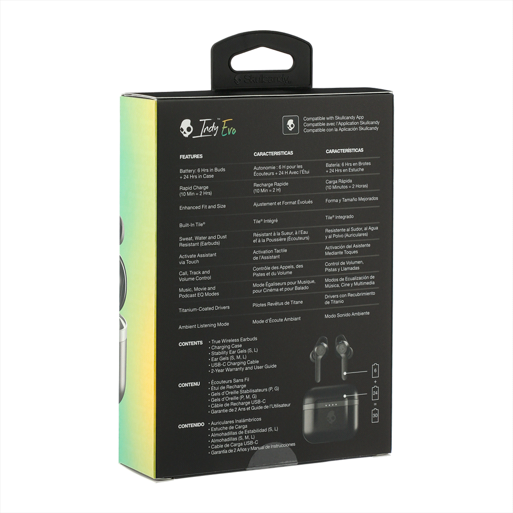 The Skullcandy Indy Evo True Wireless Bluetooth Earbud rapidly charges in just one hour and delivers 30 hours of playback time. It includes one USB Type-C cable for charging, one set of Ear Gels, and one set of Stability Ear Gels. These waterproof wireless earbuds are integrated with the Tile app and allow you to answer calls, activate your voice assistant, and change the song or volume through built-in touch sensors — all without reaching for your mobile device. Material: ABS plastic Includes 1 USB Type-C cable, 1 set of Ear Gels (S, M, L), and 1 set of Stability Ear Gels (S, L) With rapid-charge technology, just 10 minutes of charging provides 2 hours of playback Case and earbuds can be fully charged in 1 hour Provides 30 hours of playback when fully charged Fully integrated with the Tile app Built-in touch sensors IP55 waterproof rating