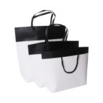 Small Black & White Kraft Boutique Paper Bag is ideal for showcasing your elegant branding logos. These personalised paper bags are available to order in a choice of colours, sizes and printing methods. They can be supplied unprinted or custom printed, available with screen print, full-colour print, add-on stickers, add-on stamps, or hot stamping. These paper bags does not only have an excellent capacity for carrying all your goods, but also for displaying your company logo and name. Give them away at any promotional location or take them with you anywhere you go to increase your brand exposure! Material - 250gsm paper