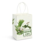 Small paper carry bag with strong paper rope handles. It is manufactured from 190gsm kraft paper and can be branded with stunning edge-to-edge spot colour or full colour printing on all sides including the base. A production lead time of 25 working days applies to this product by air freight and larger orders can be sea freighted on request to reduce the freight cost.