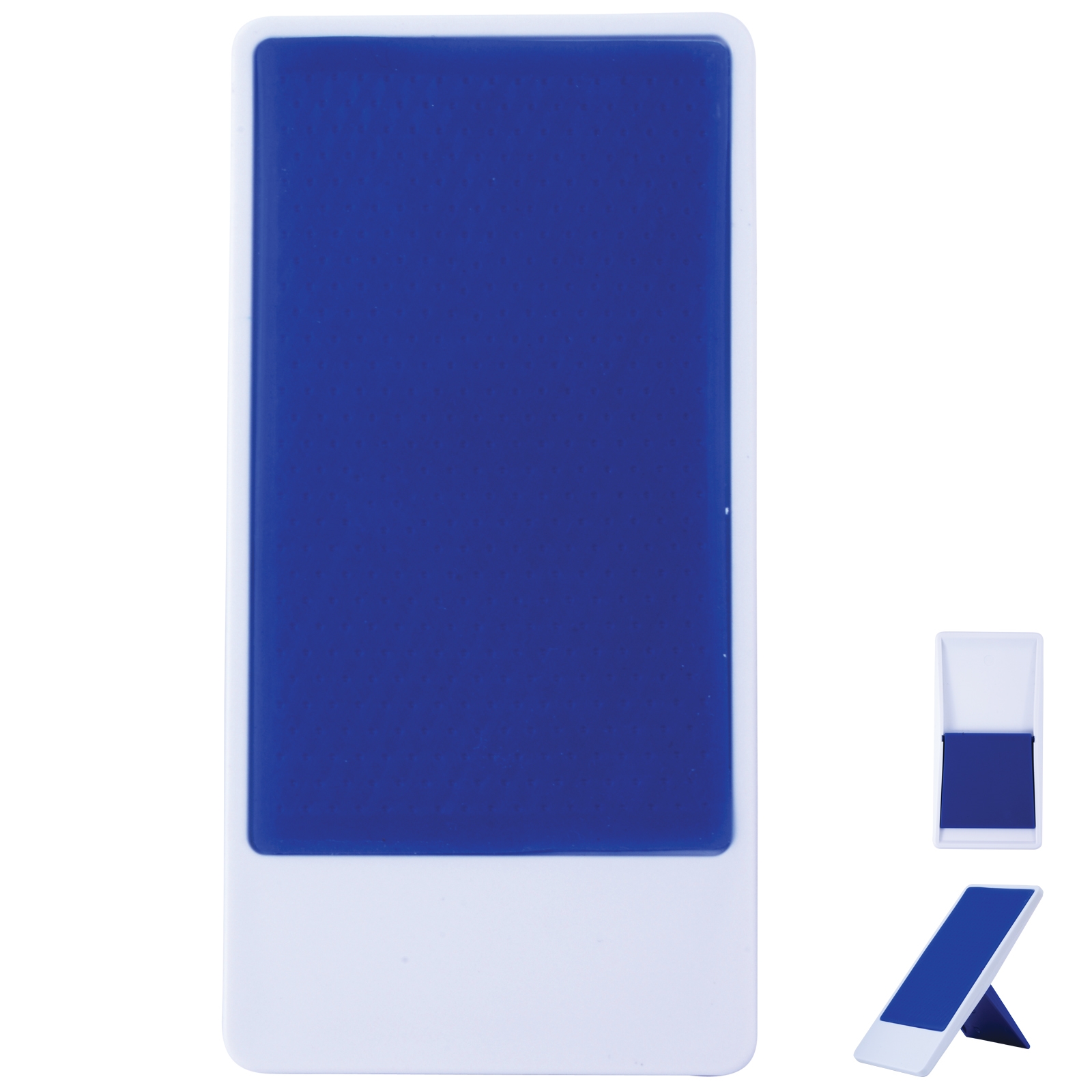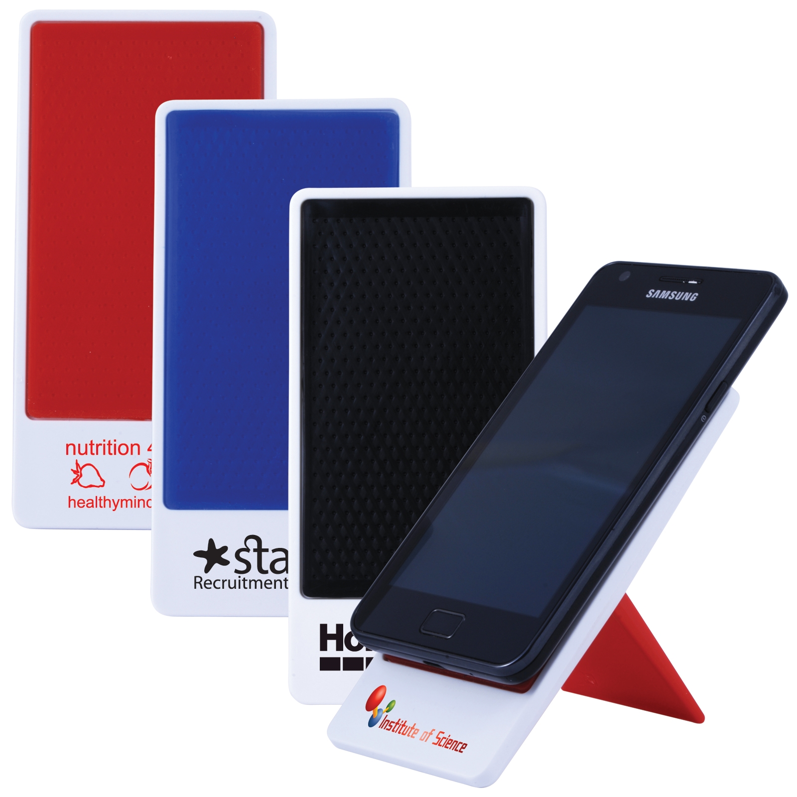 White folding phone holder with coloured silicone grip pad. Keeps your mobile in an upright easily viewable position.