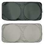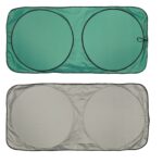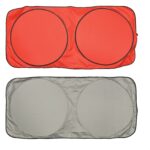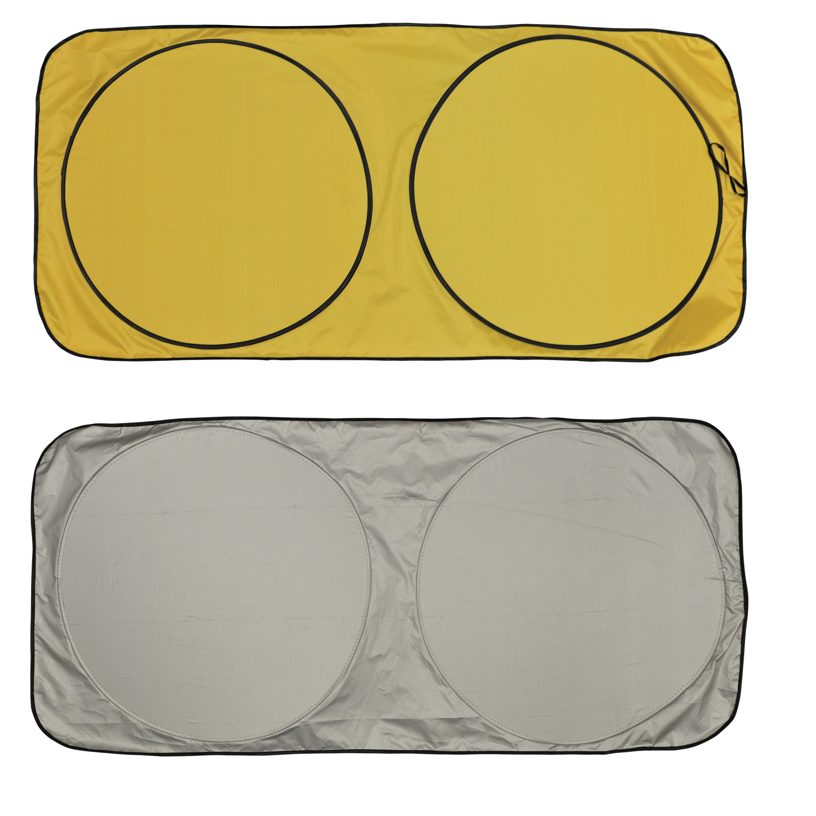 Folding polyester sun shade for car windscreen with contrast trim, black elastic retainer strap and handy storage pouch.