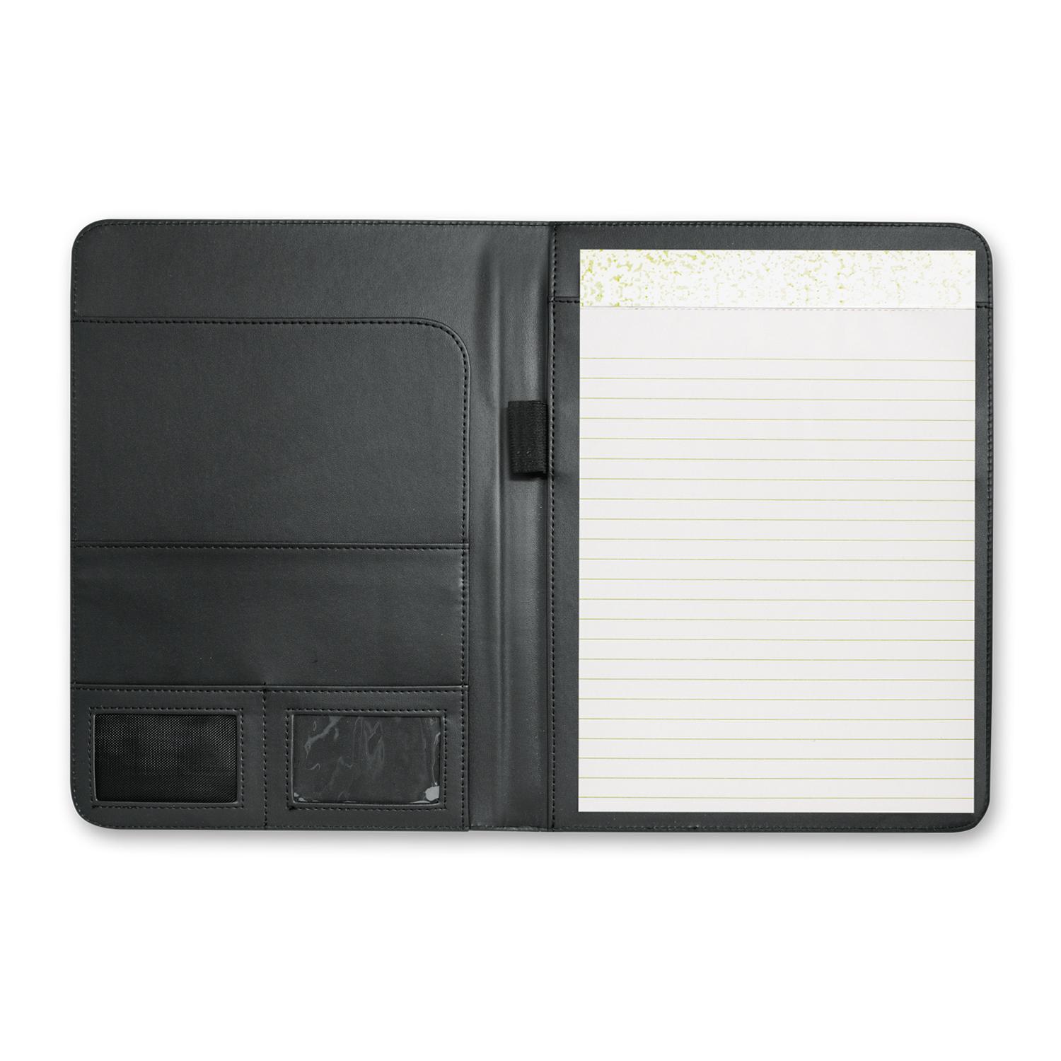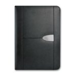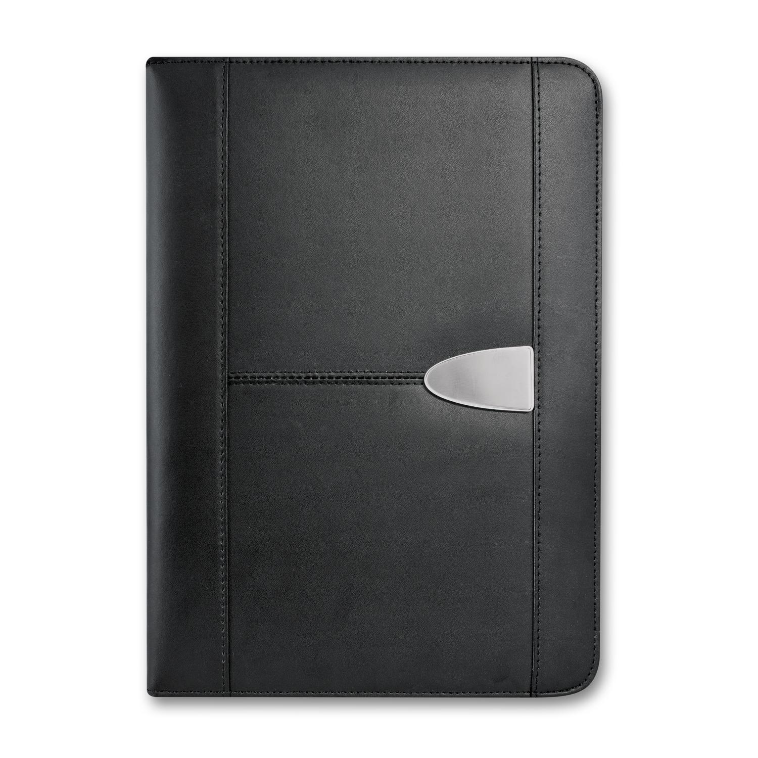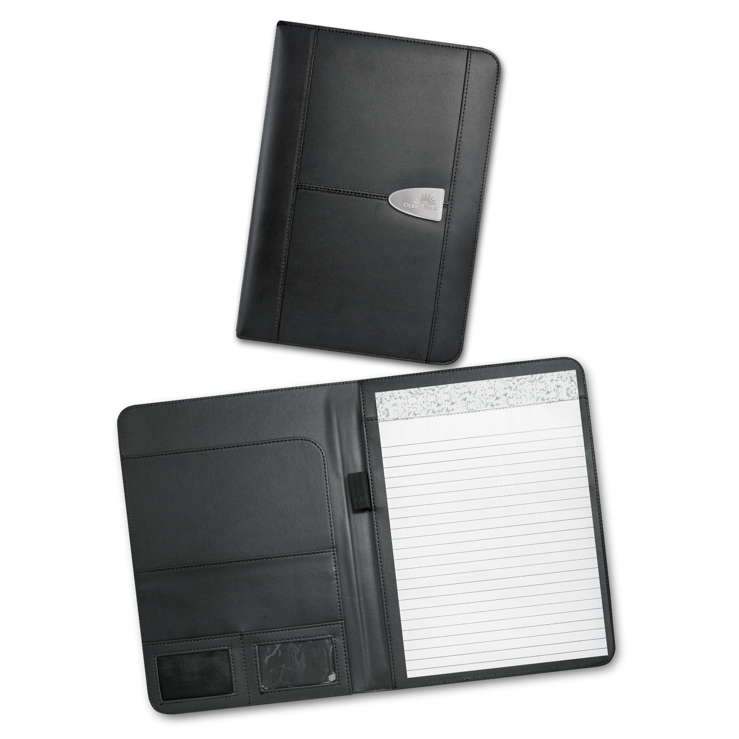 Superior large size bonded leather luxury portfolio with a lined pad, a business card pocket and a pen loop. It features a unique metal centre plate which can be branded with the choice of a resin coated finish or a metal insert which laser engraves to an oxidised White colour. It can also be printed or laser engraved directly onto the portfolio and the laser engraving can include individual names for an additional charge. The portfolio surface laser engraves to a matt Brown finish. Decoration options: Pad Print | Laser Engraving | Resin Coated Finish