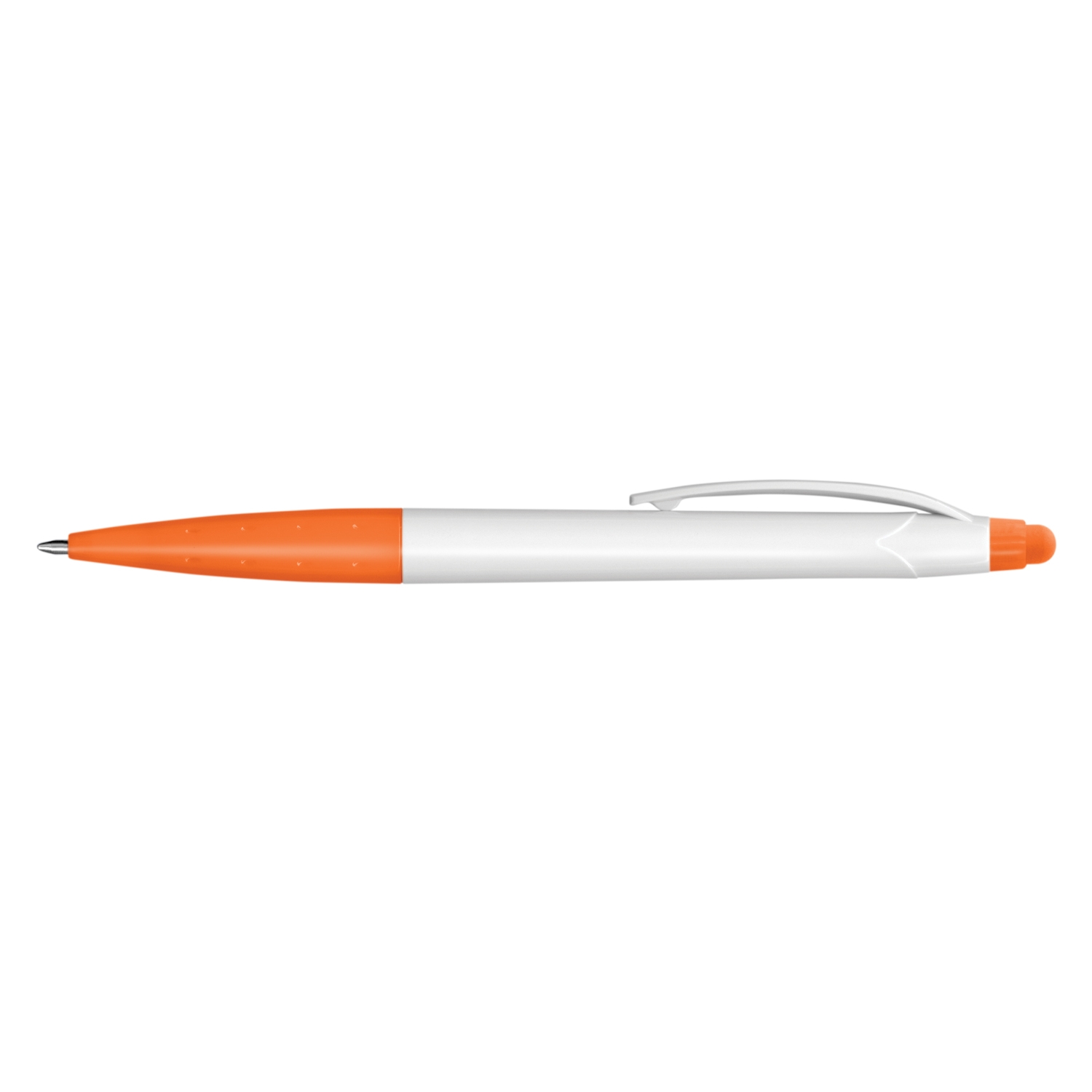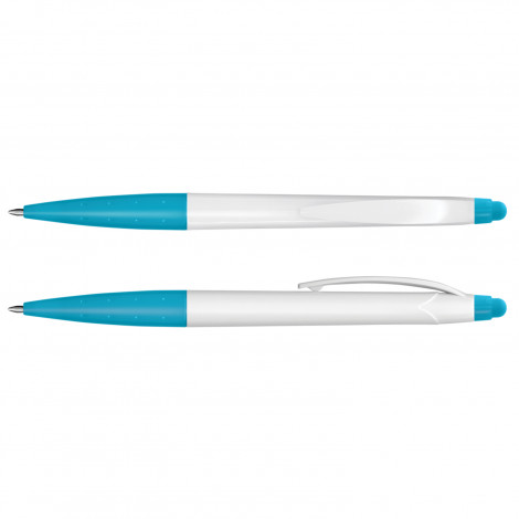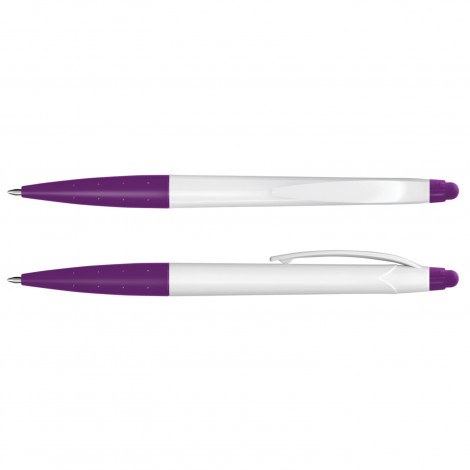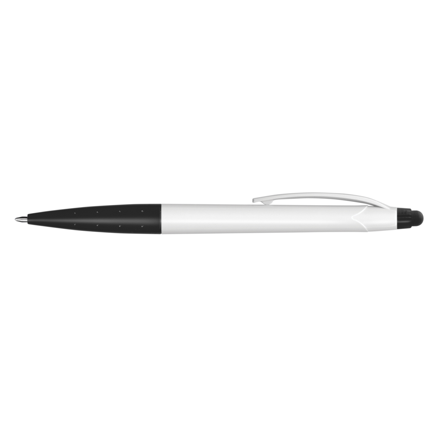 Twist action plastic ball pen with a white barrel and a stylus for use with touch screens. It has a Black ink refill with 500 metres of writing ink and a tungsten carbide ball for improved writing quality. . Decoration options: Pad Print | Screen Print | Direct Digital