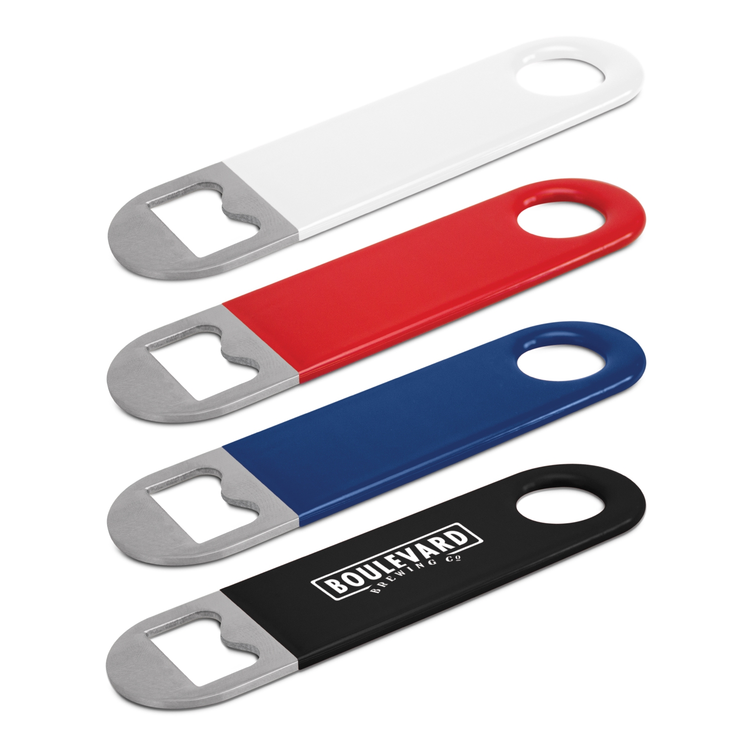 Stainless steel bottle opener with a soft touch vinyl coating on the handle which is available in both small and large sizes. . Decoration options: Pad Print | Direct Digital