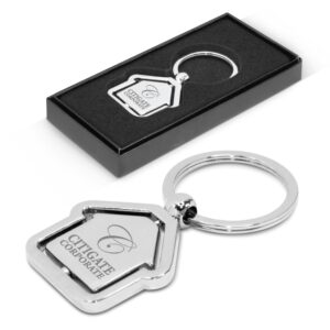 Shiny chrome metal key ring with a rotating house shaped inner part which is nicely presented in a Black gift box. It can be laser engraved to a natural etch on one or both sides. Decoration options: Laser Engraving