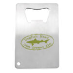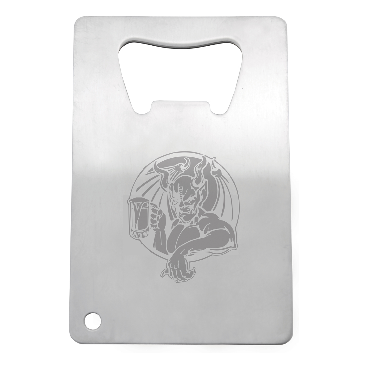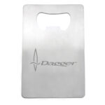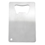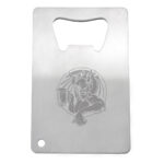A flat slim credit card size bottle opener. Made with stainless steel. Laser engraving recommended. Printing will fade over time. Material: Stainless Steel.