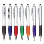 Touch screen stylus twist action ball pen. silver sprayed barrel, translucent coloured and rubber finished grip, touch screen stylus on the top, metal clip, polished chrome plated trims, slim refill.