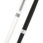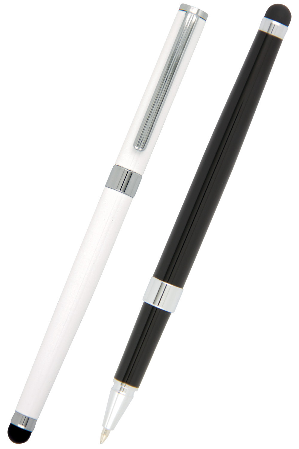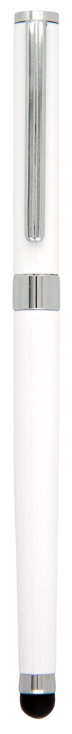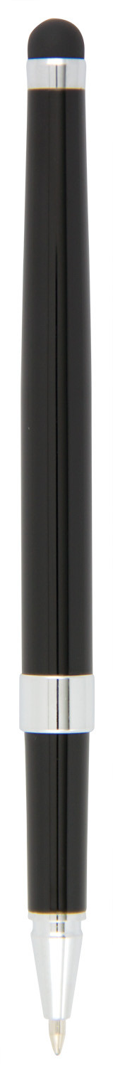 Metal rollerball pen with touch screen stylus for use on iPads, tablets and other touch screen devices. Black ink refill.