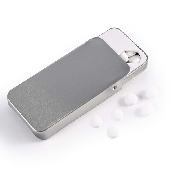 Approx 50 mints in a silver tin with sliding lid.