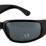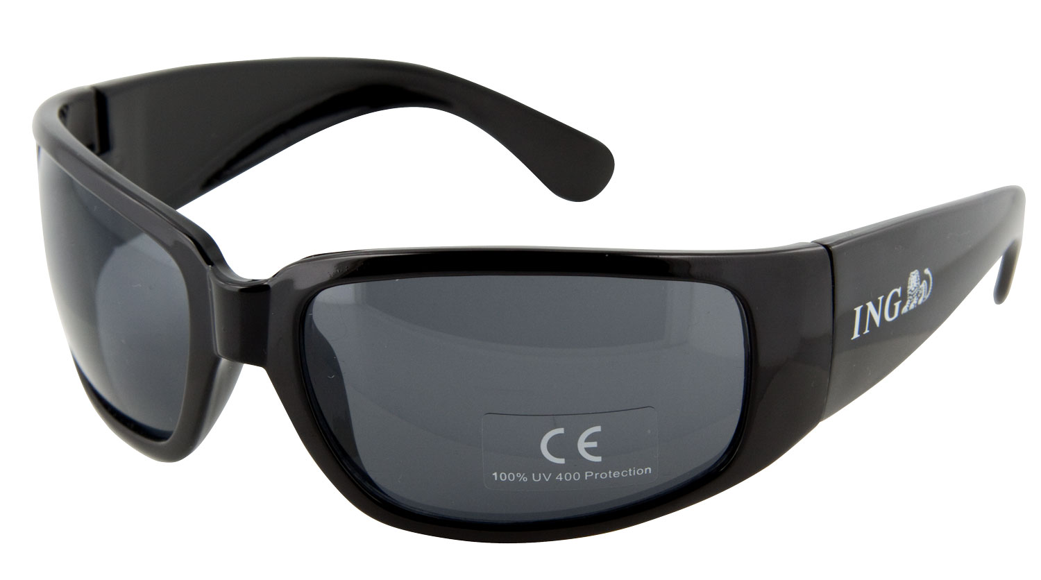 Black wrap around style sunglasses with UV400 rated lenses for maximum protection.