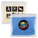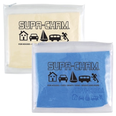 Yellow synthetic pre wet body towel/chamois with rounded corners in cello bag packaged in clear PVC pouch. Materials: Synthetic Chamois in Clear PVC Pouch