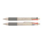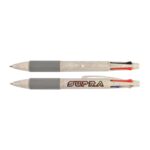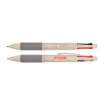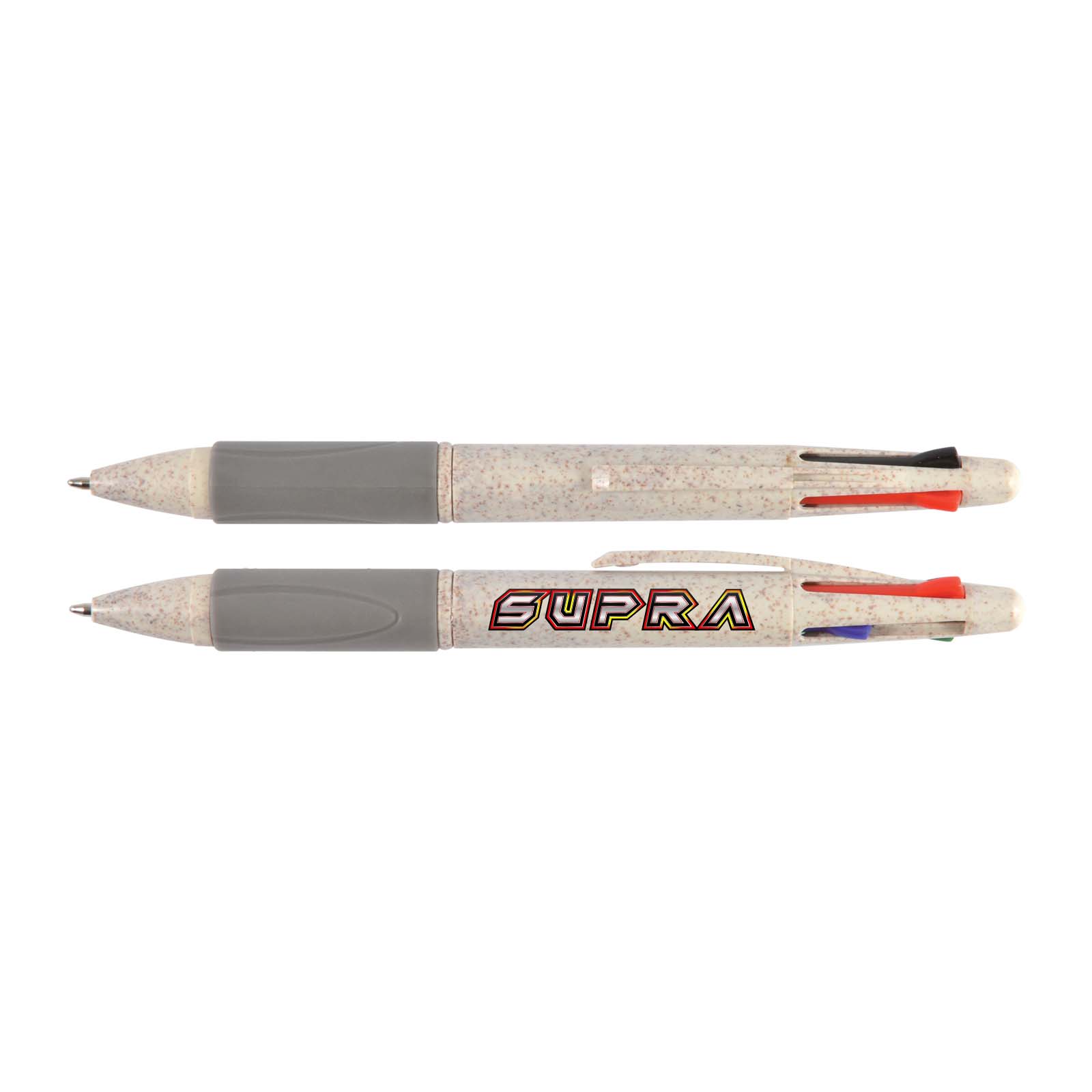 Push button ballpoint pen.Made from a 50/50 blend of wheat fibre and polypropylene.4 different ink colours Black, Blue, Green, Red,Grey grip. Eco Credentials: Wheat fibre - by product Printed using renewable energy. (Packaging options available)