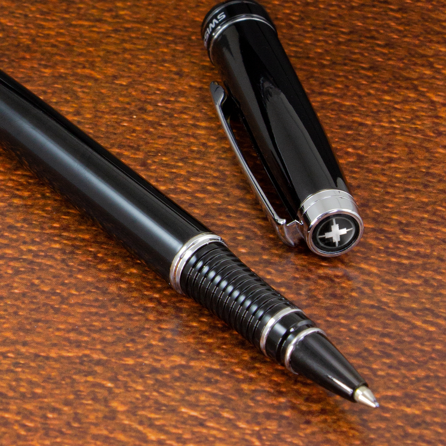Precision Swiss Peak rolling ball pen which has a lacquer finished brass barrel and shiny chrome accents. It has a blue rolling ball refill with 1200 metres of German manufactured Dokumental ink and subtle Swiss Peak branding on the centre ring and cap. Heritage laser engraves to a brass finish and is presented in a Swiss Peak sleeve.