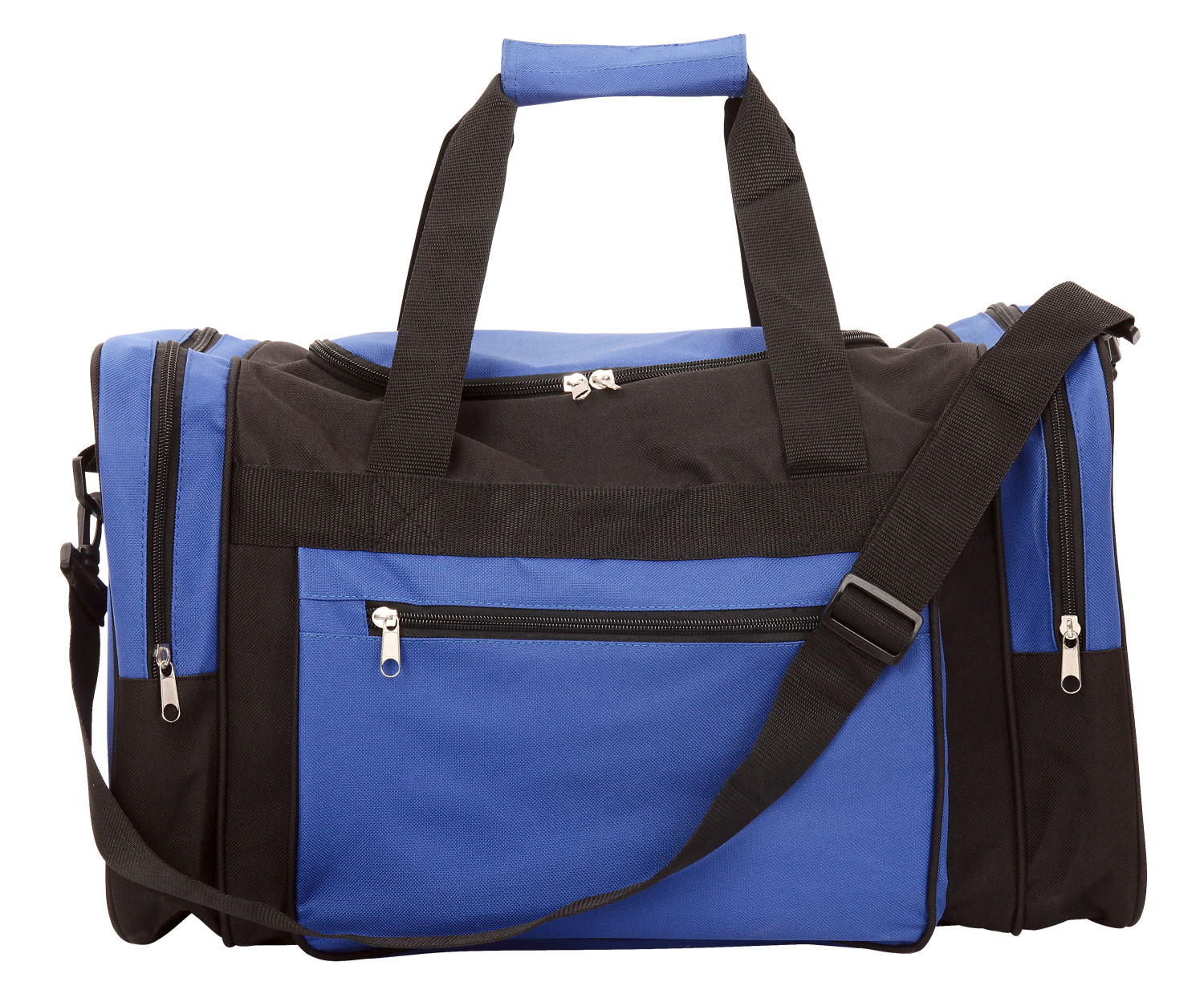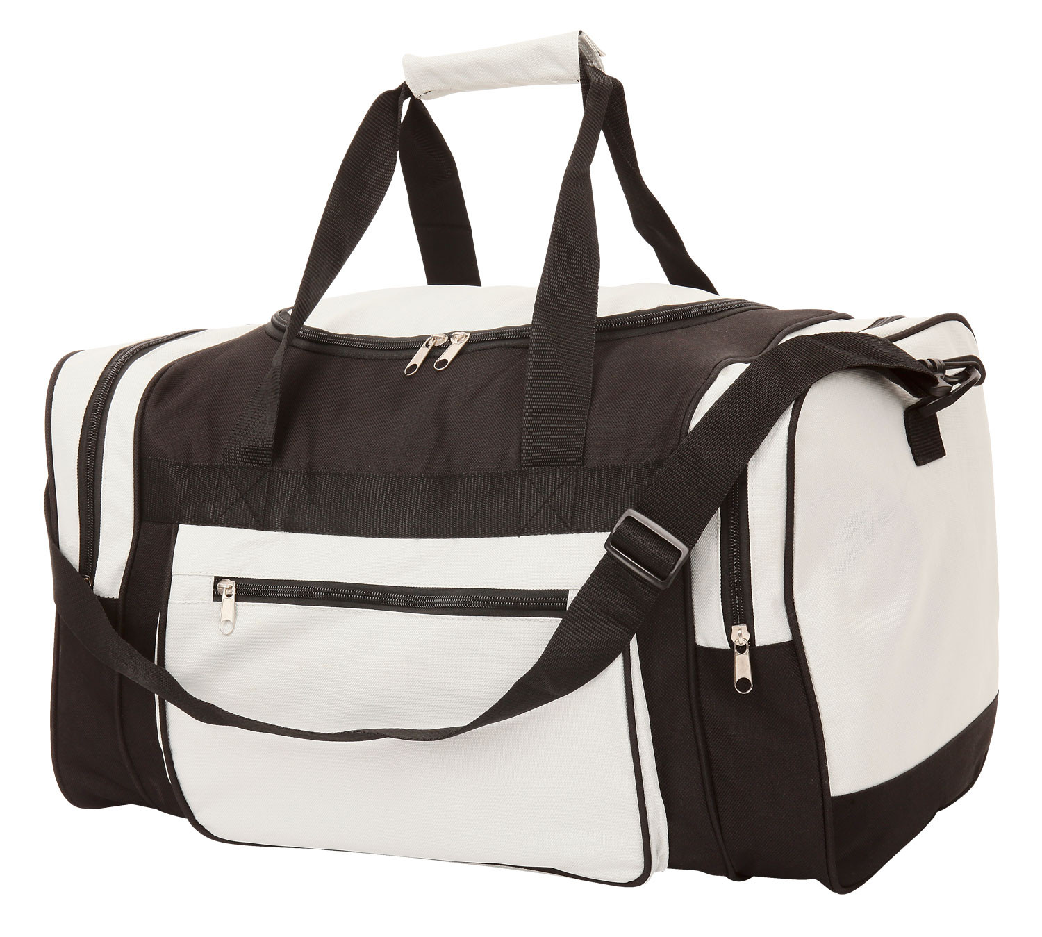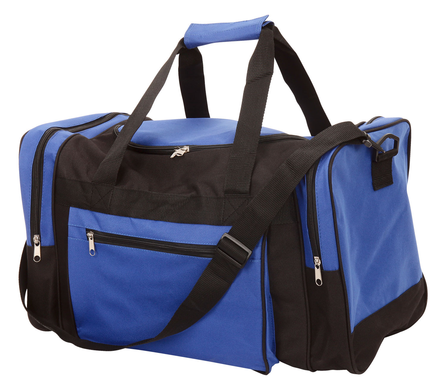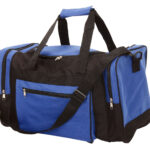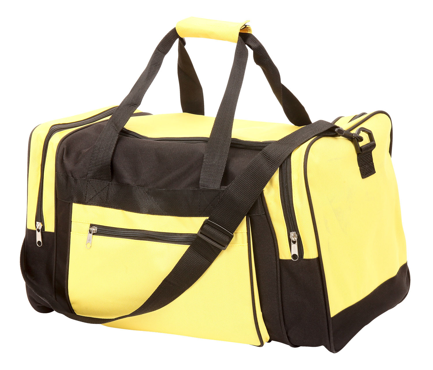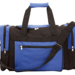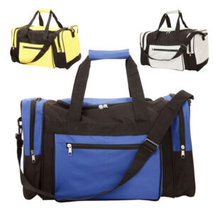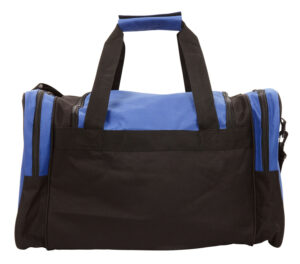 Large 600D sports bag with main compartment with U shape zipper for easy access, adjustable shoulder strap, carry handles, contrasting zippered side pocket and two zippered end pockets.
