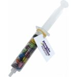 Plastic Syringe filled with 20g Choc Beans Ingredient & Best Before on each item (back of tag) *NOTE* REMOVE TIP WHEN REFILLING. CHOKING HAZARD SUPERVISE CHILDREN (Mixed or Corporate Colours available) Colours Choc Beans: Select any combination of Black, Blue, Green, Red, Purple, Yellow, & Pink Best Before: 12 months