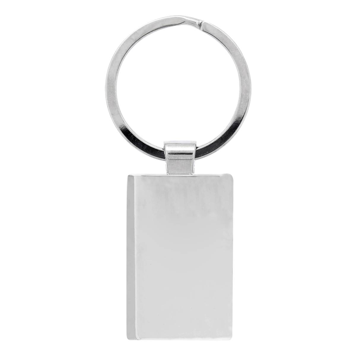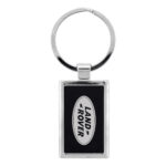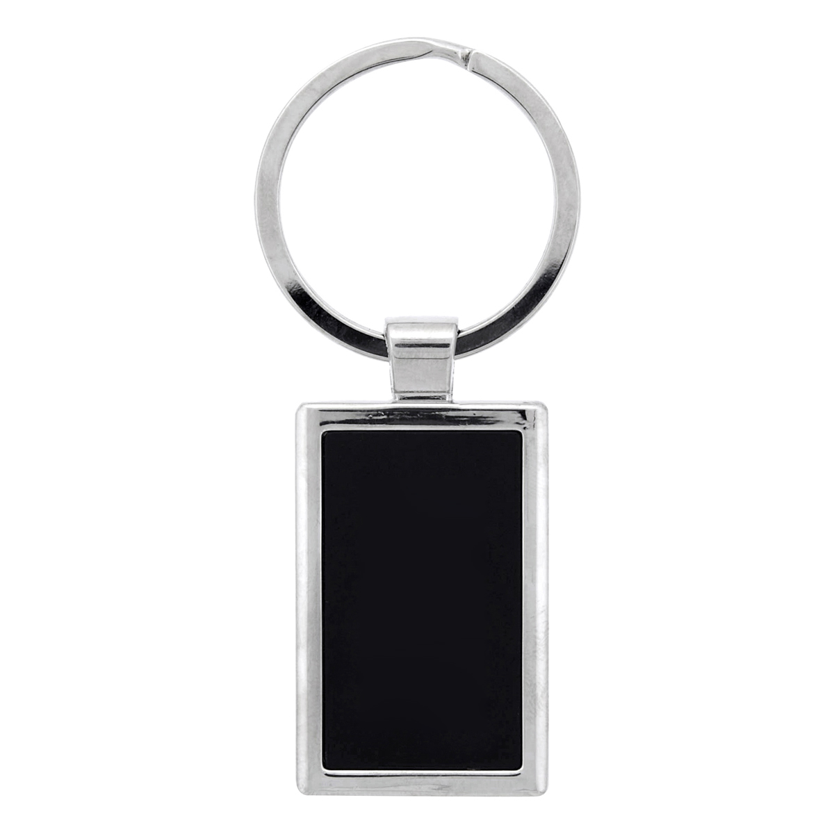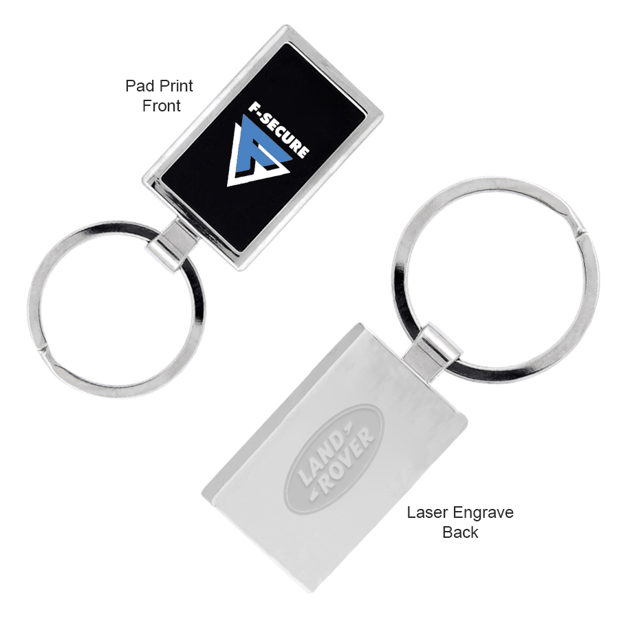 A polished chrome metal key chain with a colourful black front.