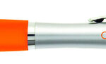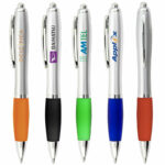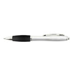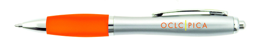 A plastic barrel click action ballpoint pen with black or blue ink, a metal pocket clip and a soft grip that snuggles to your hand.