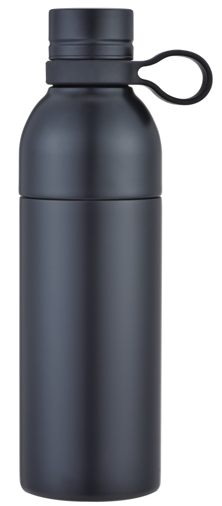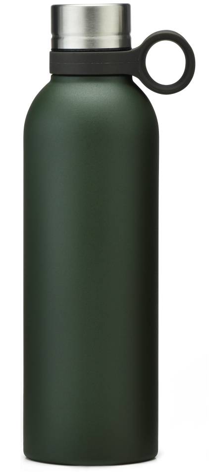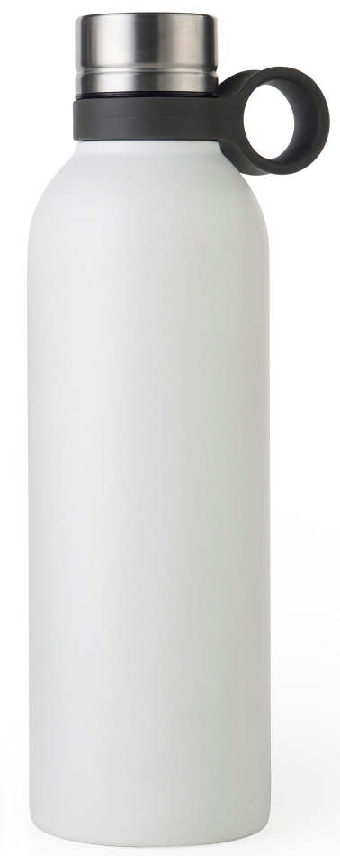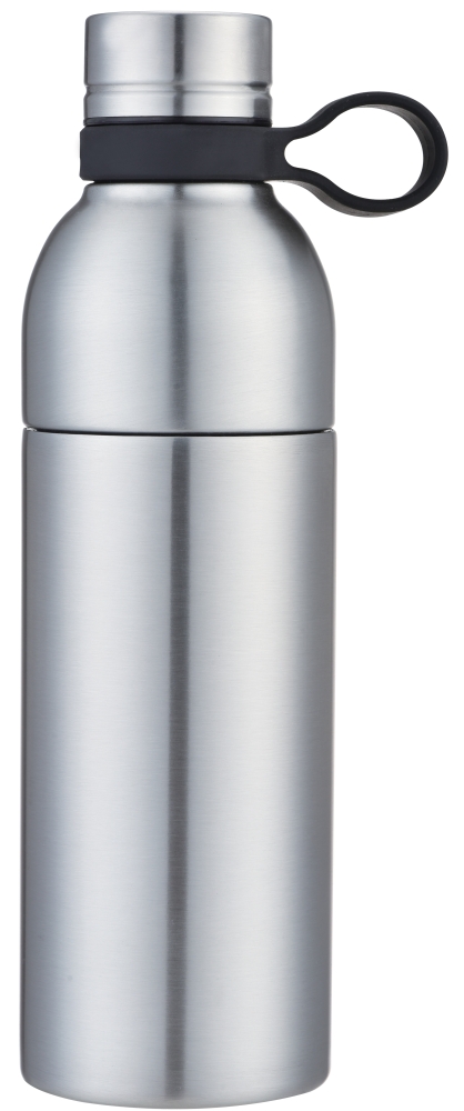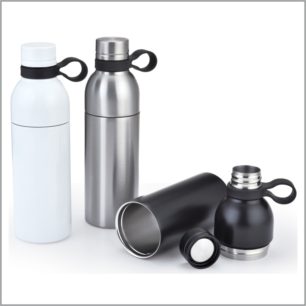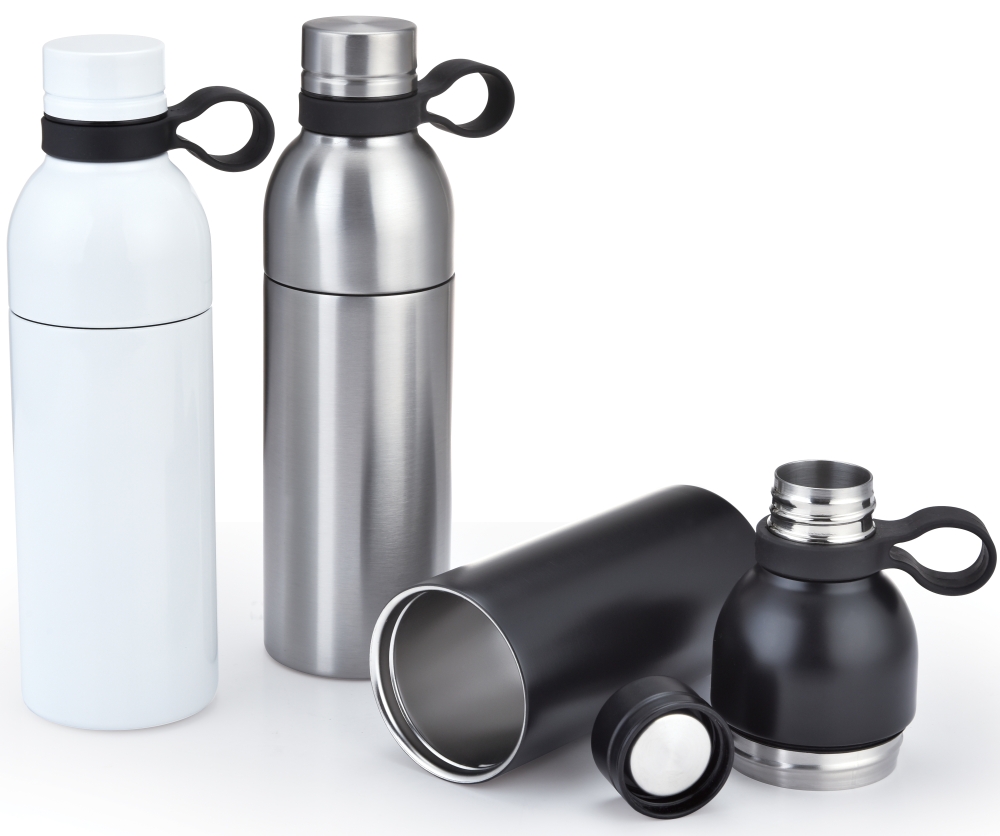 Stainless steel double wall vacuum insulated drink bottle with carabiner, trending design, high grade stainless steel inside, can be uncrewed in the top section, bottom section can be used as mug. Capacity: 550 ml