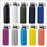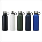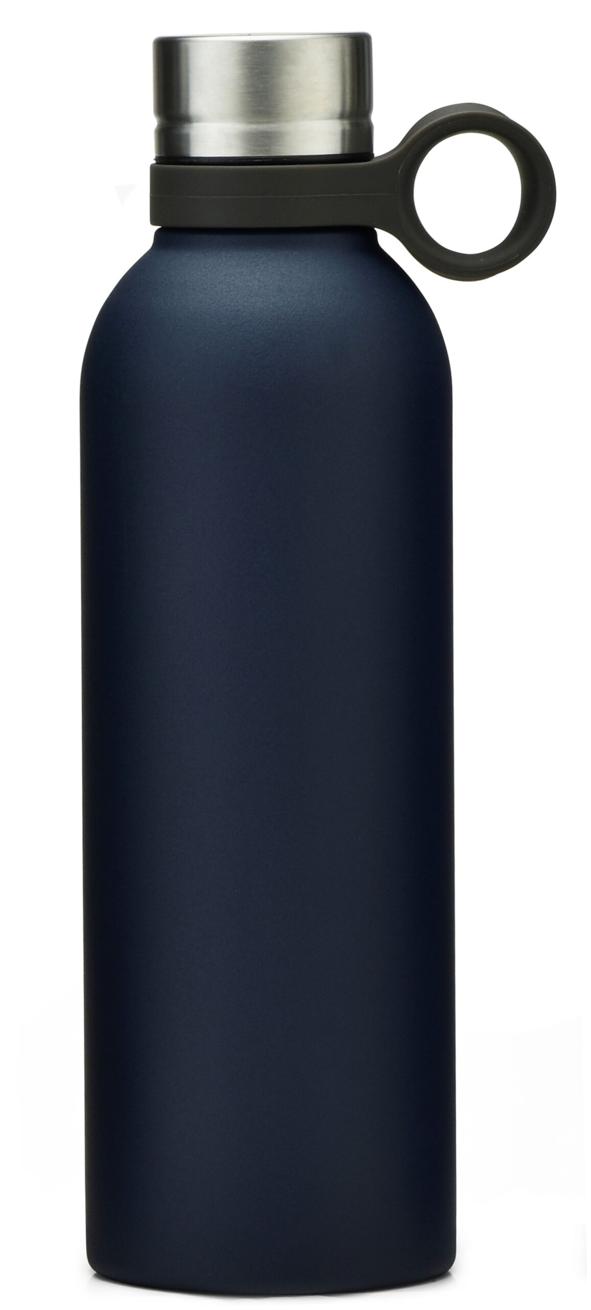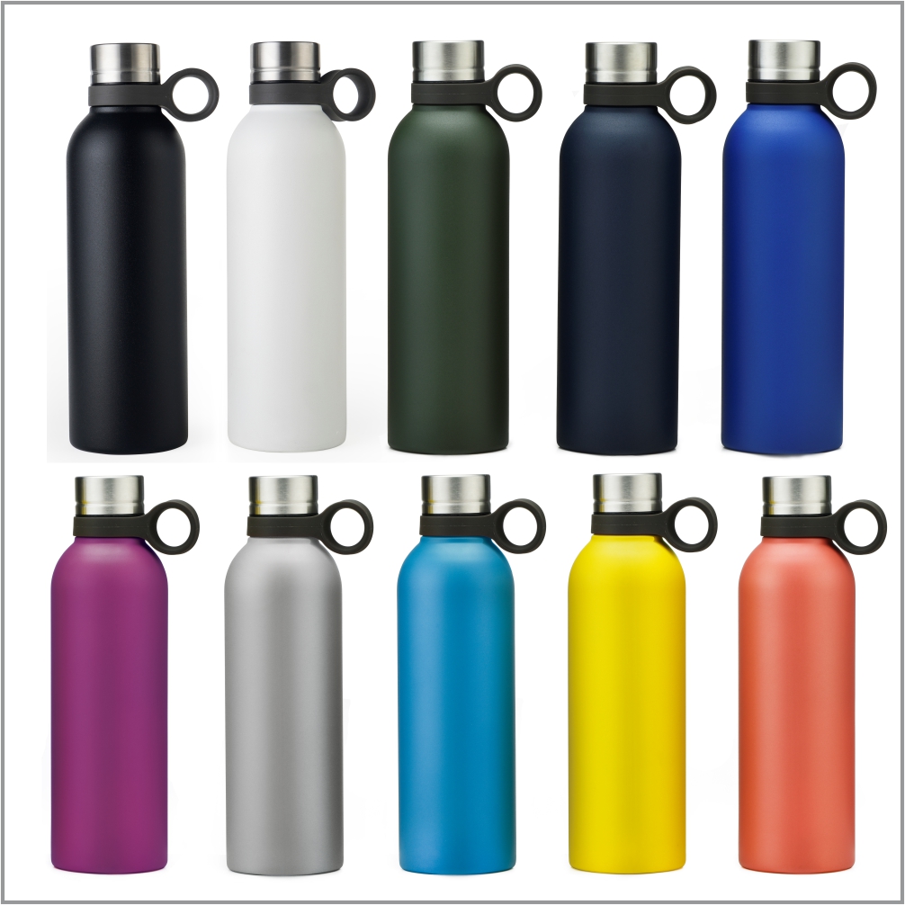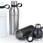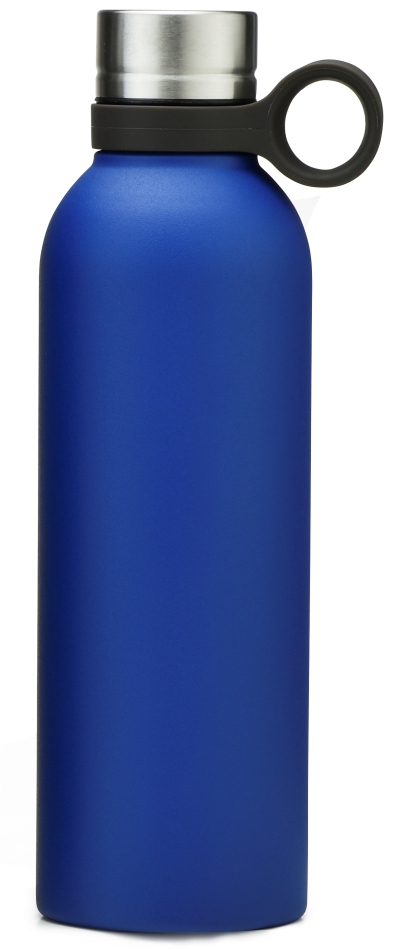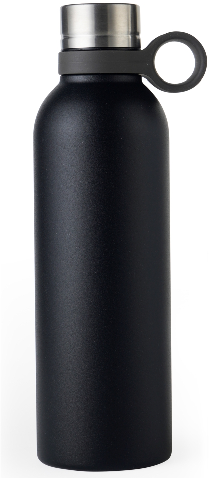 Stainless steel double wall vacuum insulated drink bottle with carabiner, trending design, high grade stainless steel inside, can be uncrewed in the top section, bottom section can be used as mug. Capacity: 550 ml