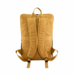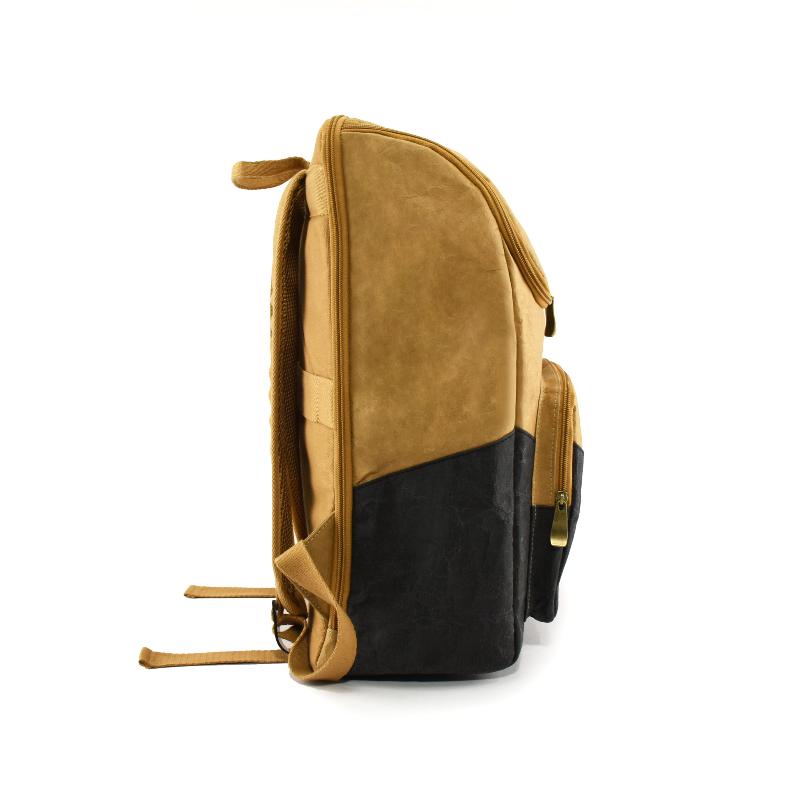 This backpack is made of German kraft paper, which is lightweight with high tear resistance, made of natural wooden fiber and synthetic latex. It has a gray 8oz canvas inner liner and top zip closure with 2 metal zip pullers. The bag features stylish black bottom part, polyester cotton webbing handle, brown canvas adjustable shoulder strap, a zip closure front pocket, 1 zip pocket, 2 open pockets inside, a laptop compartment and one water bottle pocket and a mesh pocket.This bag offers ample storage space and organization options. The combination of prewashed washable kraft paper and canvas materials gives it a stylish yet durable look. The presence of multiple pockets, including a dedicated computer pocket, enhances its functionality and usability.