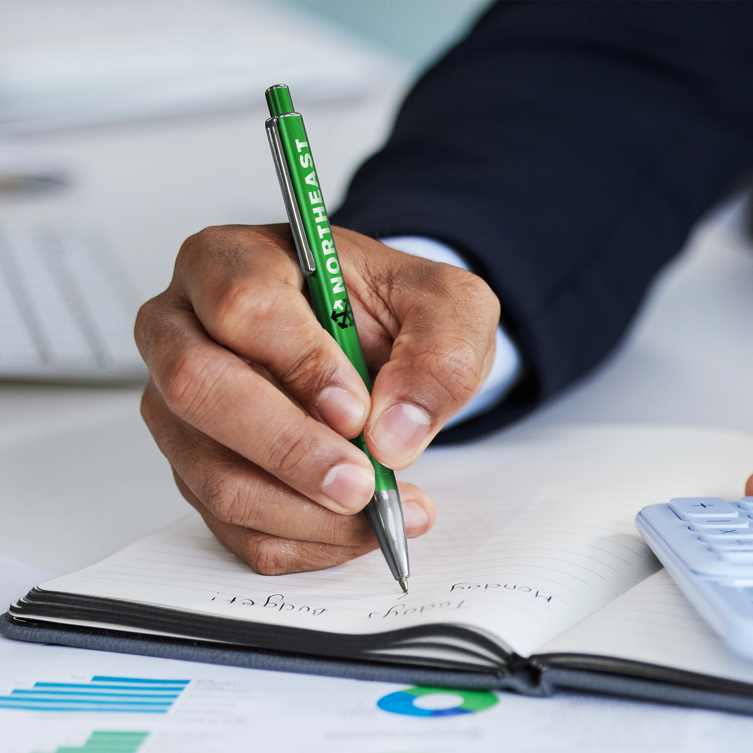 Retractable aluminium ball pen with a matte anodised barrel, a unique patterned grip, and shiny chrome trim. It has 800m of black German manufactured Dokumental ink and can be presented in an optional pen sleeve or gift box.