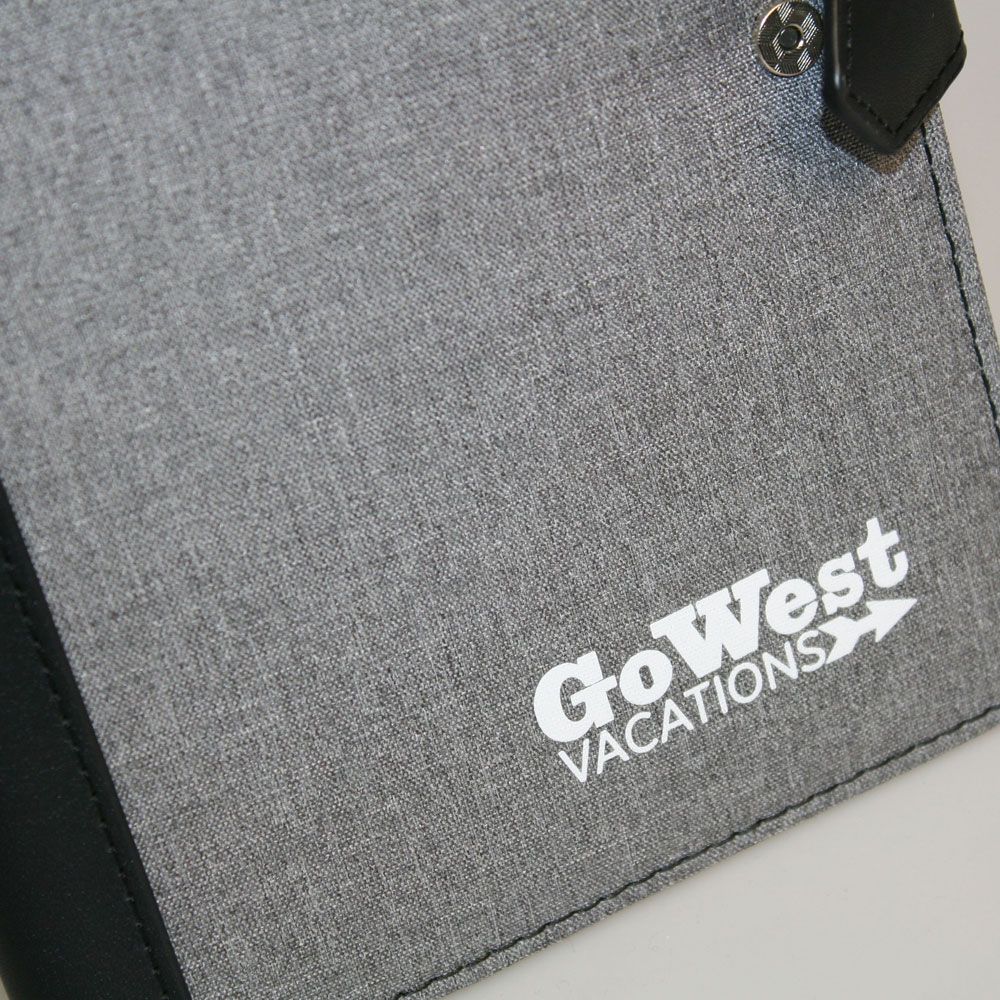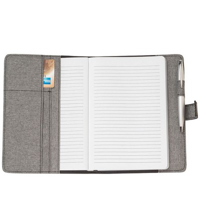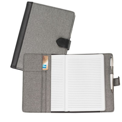 Manufactured from on-trend grey Polyester and contrasted with black PU and Nylon materials this A5 journal is the perfect tool to keep handy for all your notes. It is supplied with a replaceable 80 page ruled pad, has a magnetic snap button closure, pockets for your business cards and a pen loop.