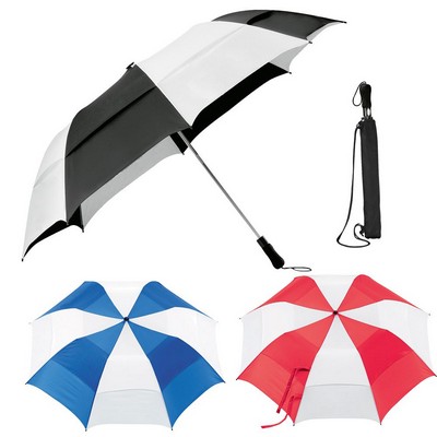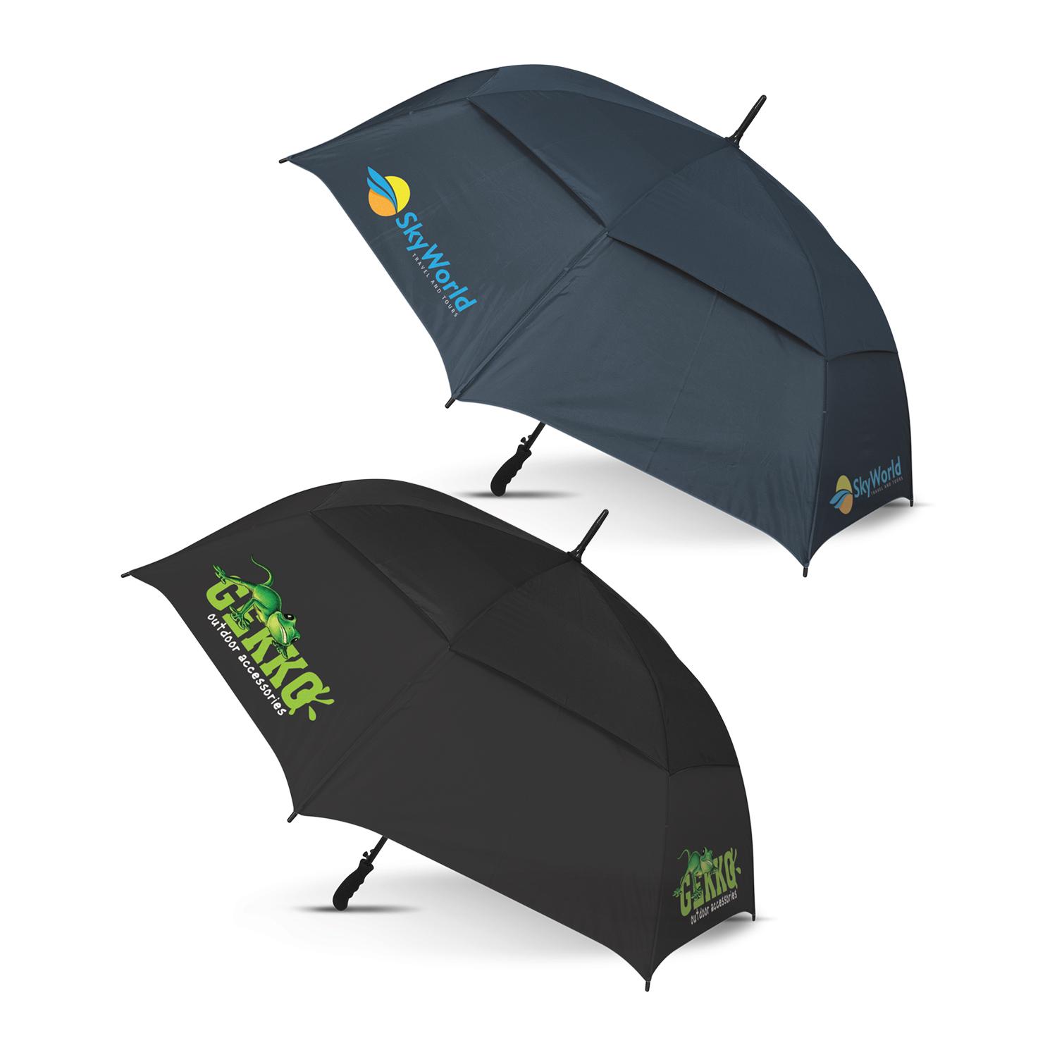 Auto open 76cm, eight panel sports umbrella manufactured from rugged 190T showerproof fabric. Has a fully vented double panel wind proof canopy complete with eight fibreglass ribs and a super strong fibreglass shaft. Other features include a contoured, soft touch rubber lacquered grip plastic tips and double velcro ties. . Decoration options: Screen Print | Digital Transfer