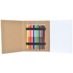 Recycled cardboard trifold sketch pad with 12 coloured pencils included (yellow, orange, red, pink, black, light blue, light green, green, purple, maroon, blue and brown). Each travel sketch pad includes 50 pages of plain paged paper and is perfect for taking your creativity with you anywhere you go. Colour pencils secured with individual elastic loops. Pencils are lead free.