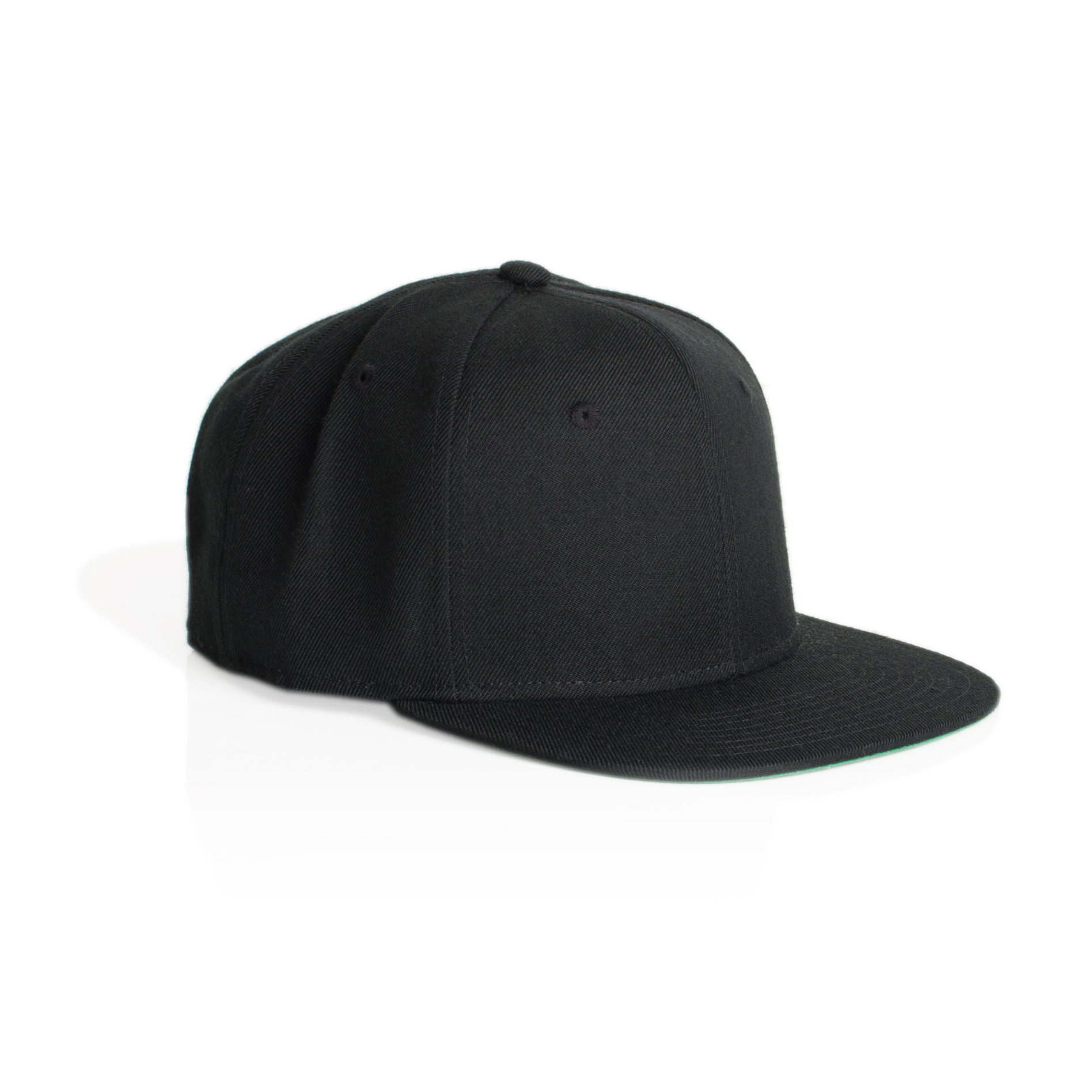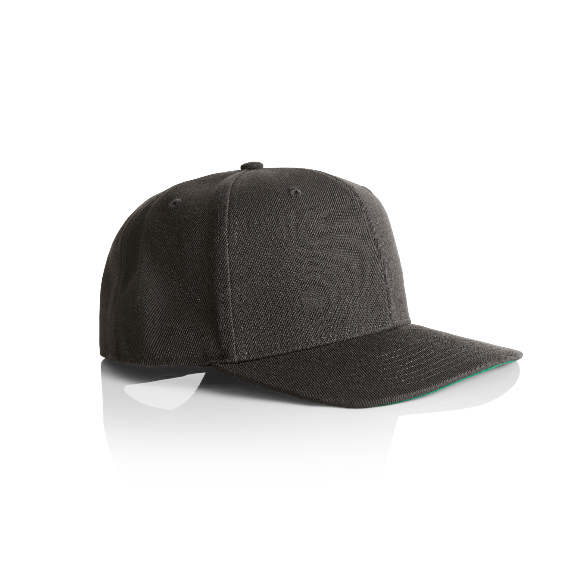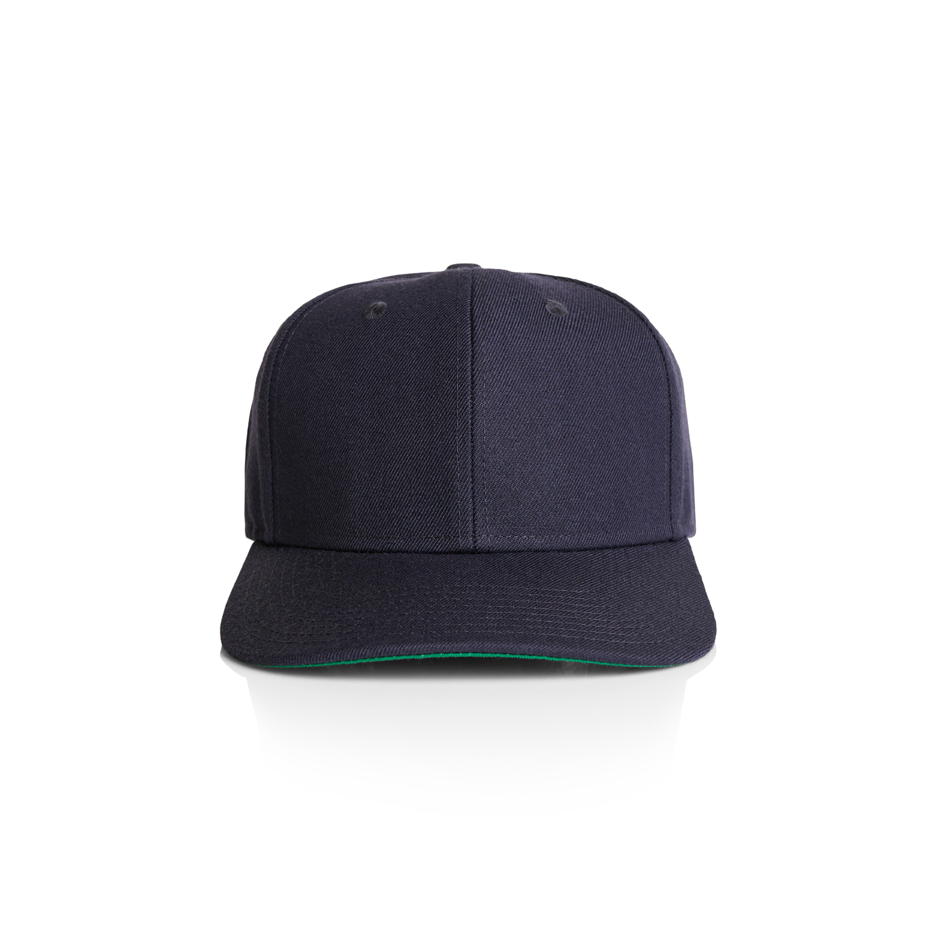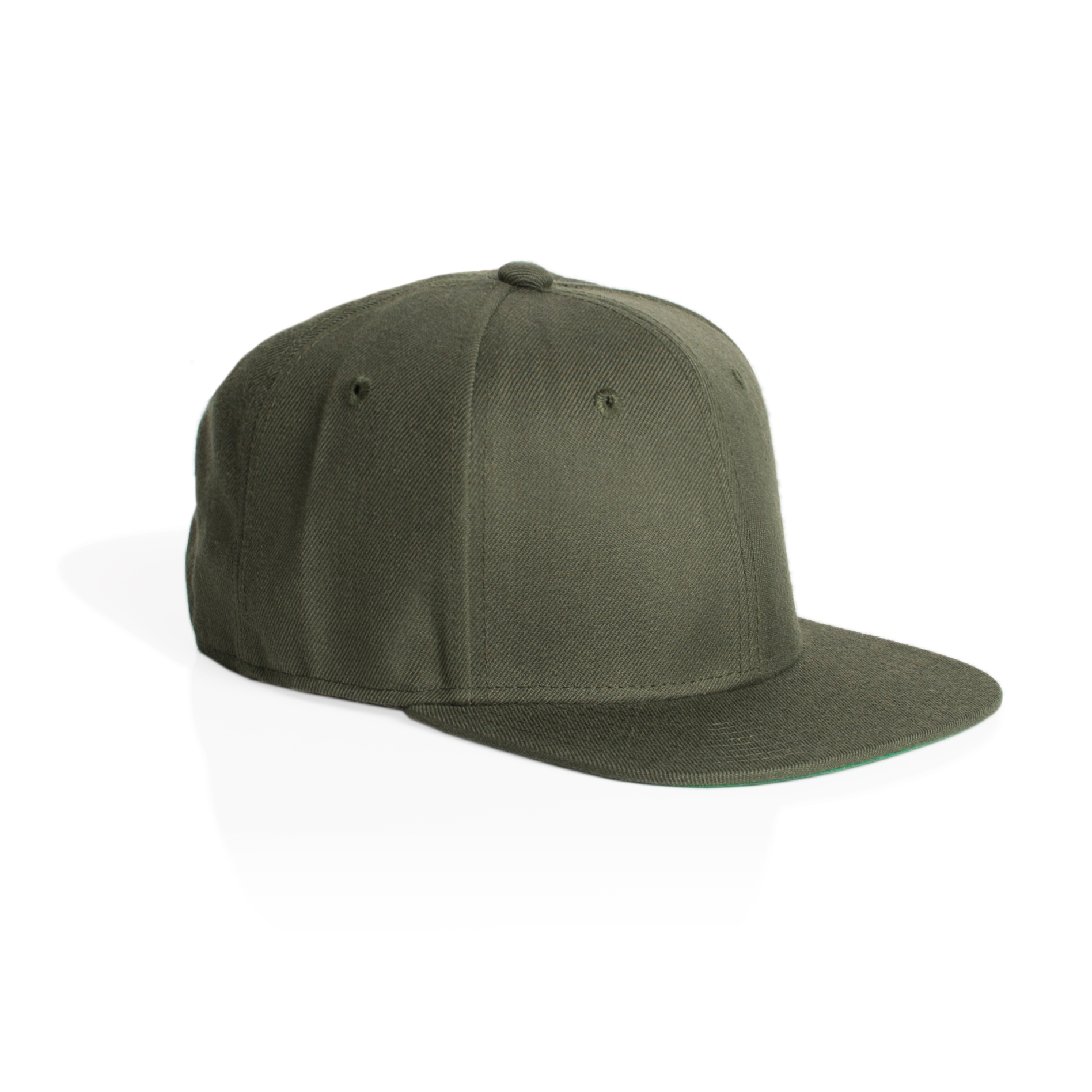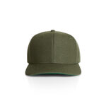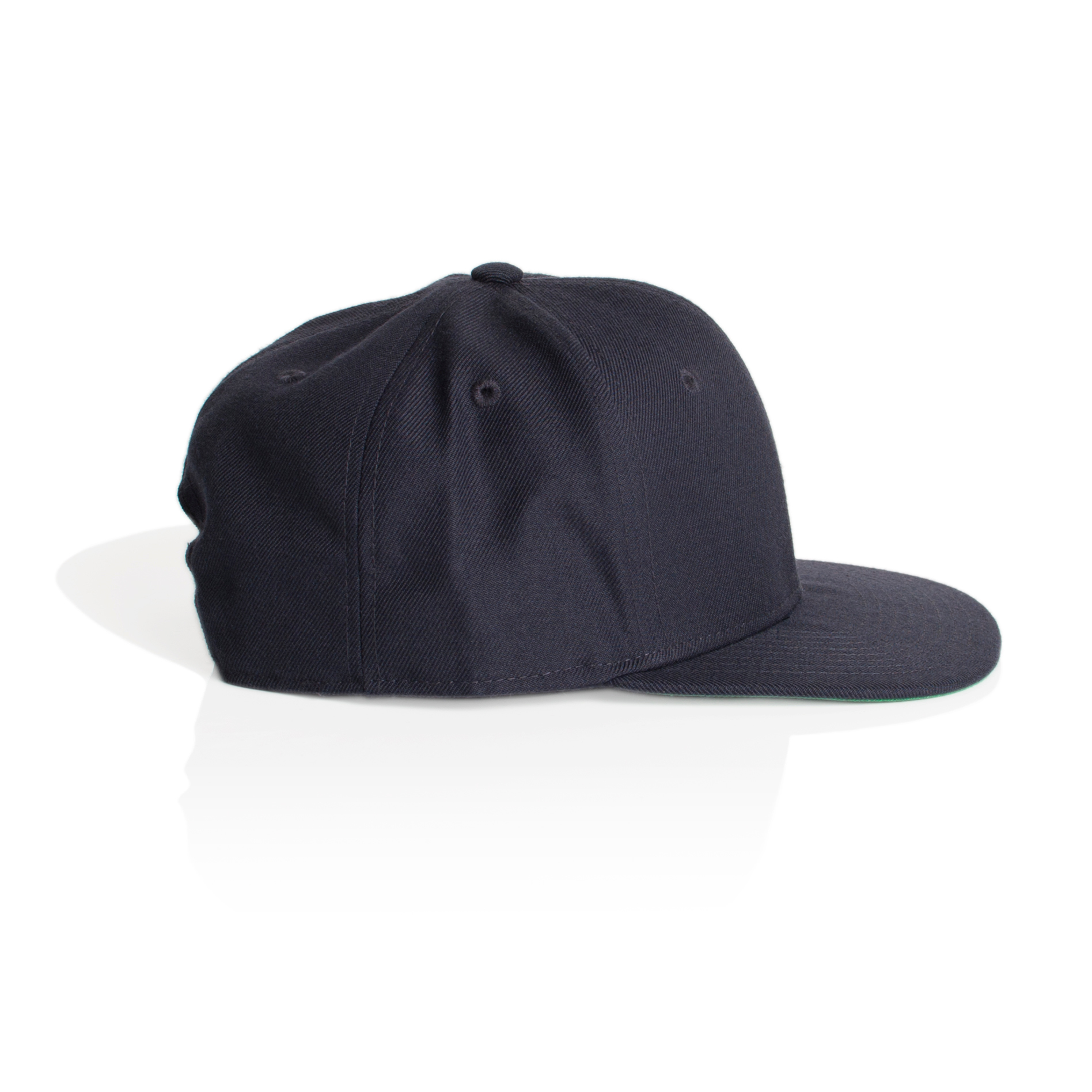 High profile snapback cap, adjustable plastic fastener, eyelets, green under-peak lining, mid weight, 80% acrylic 20% wool