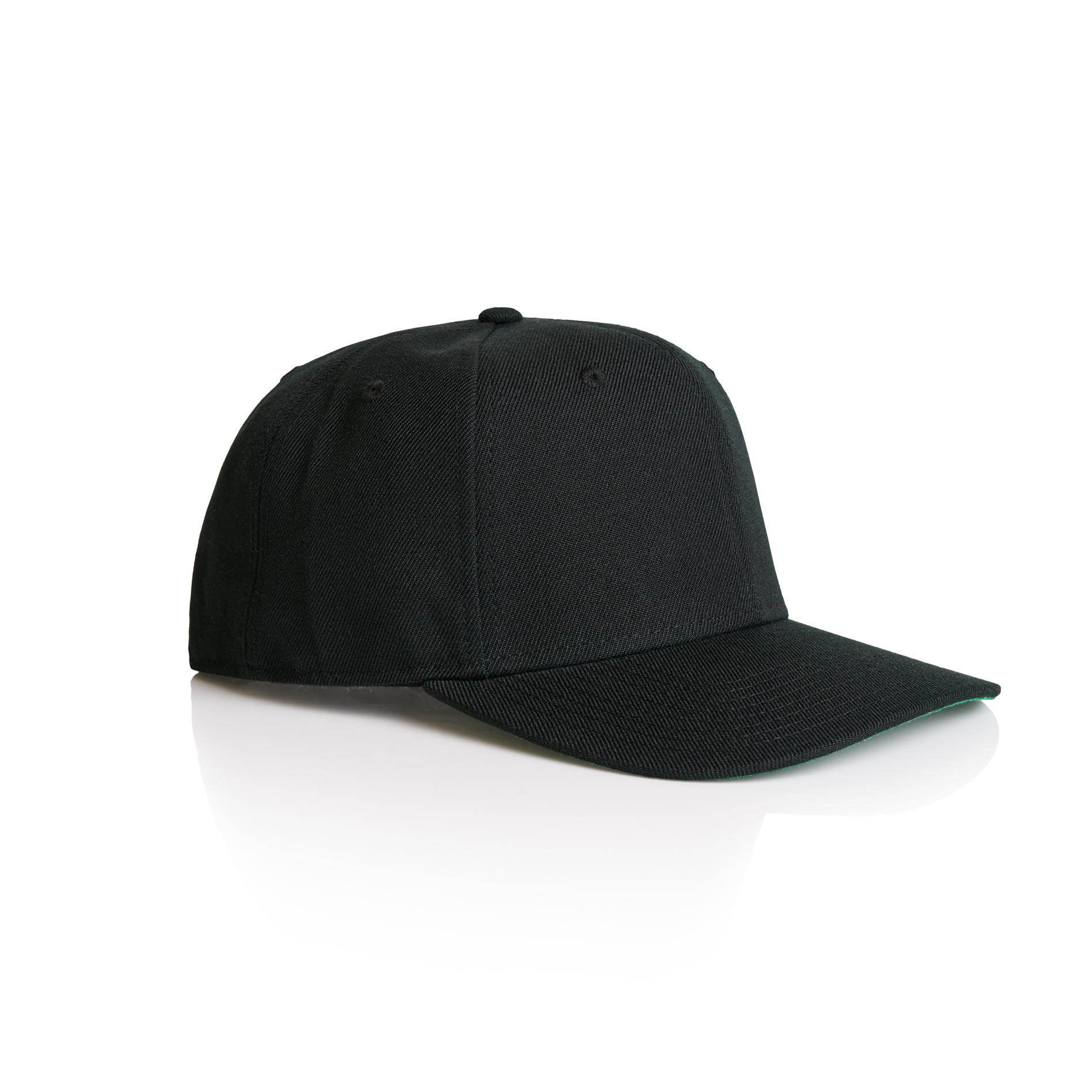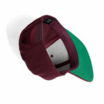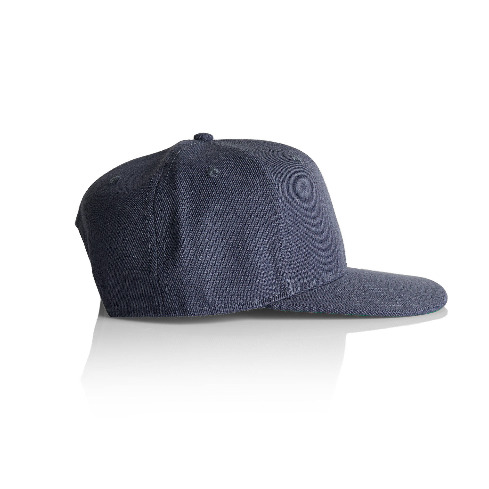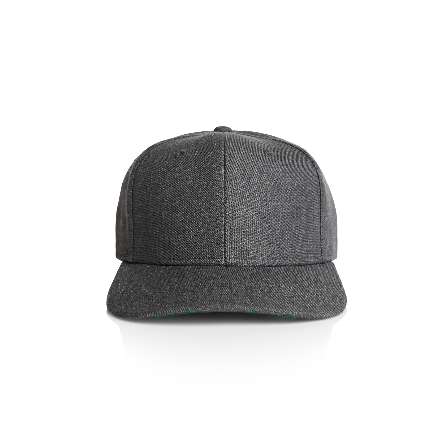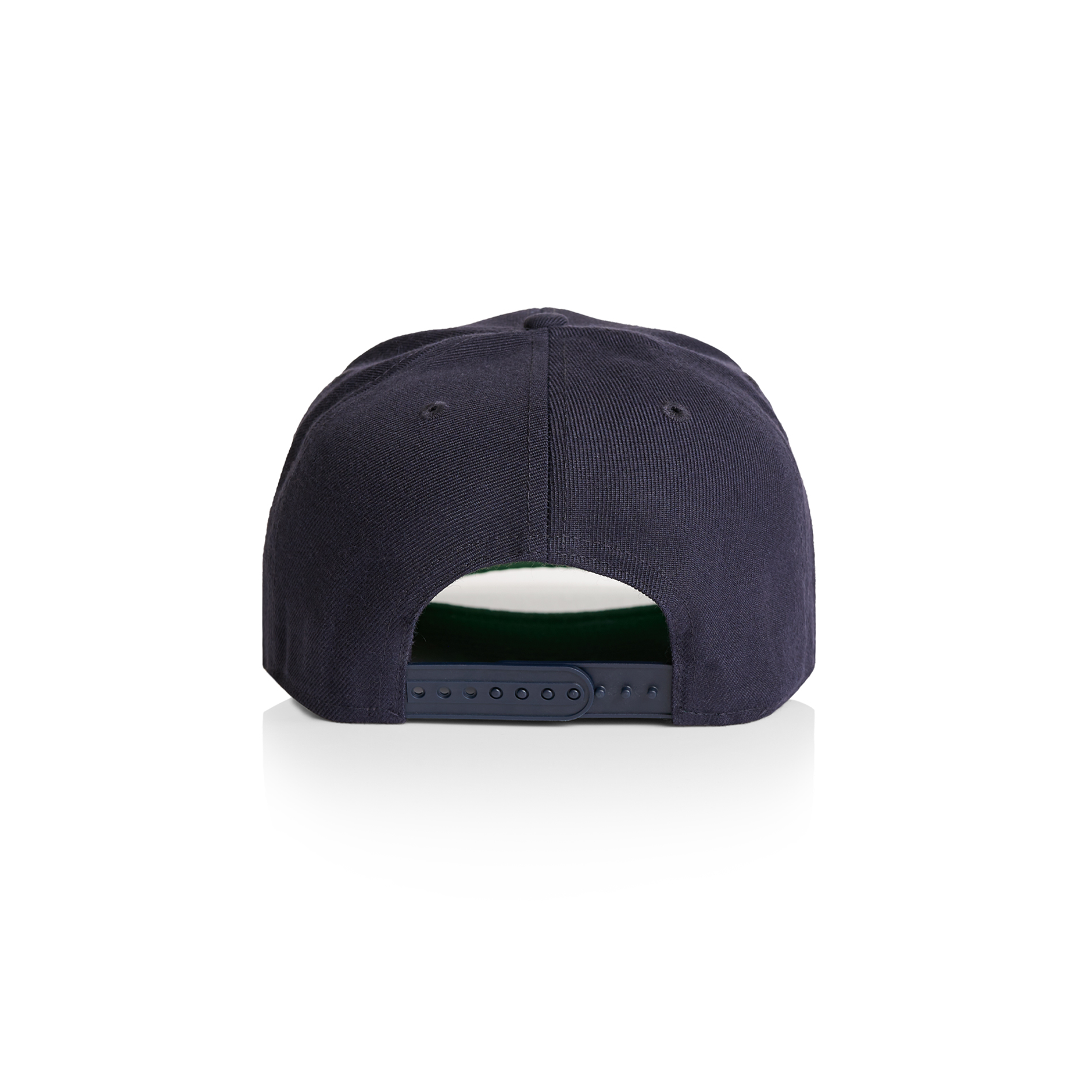 High profile snapback cap, adjustable plastic fastener, eyelets, green under-peak lining, mid weight, 80% acrylic 20% wool