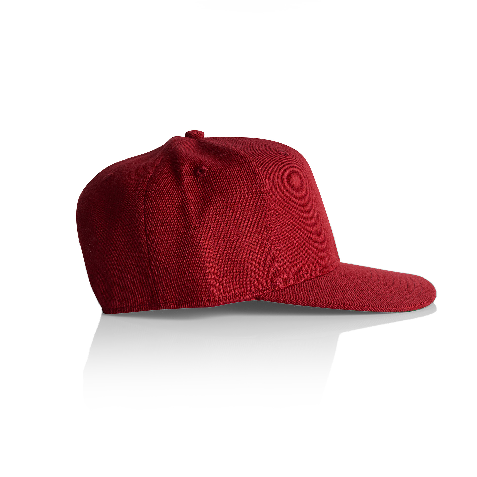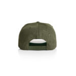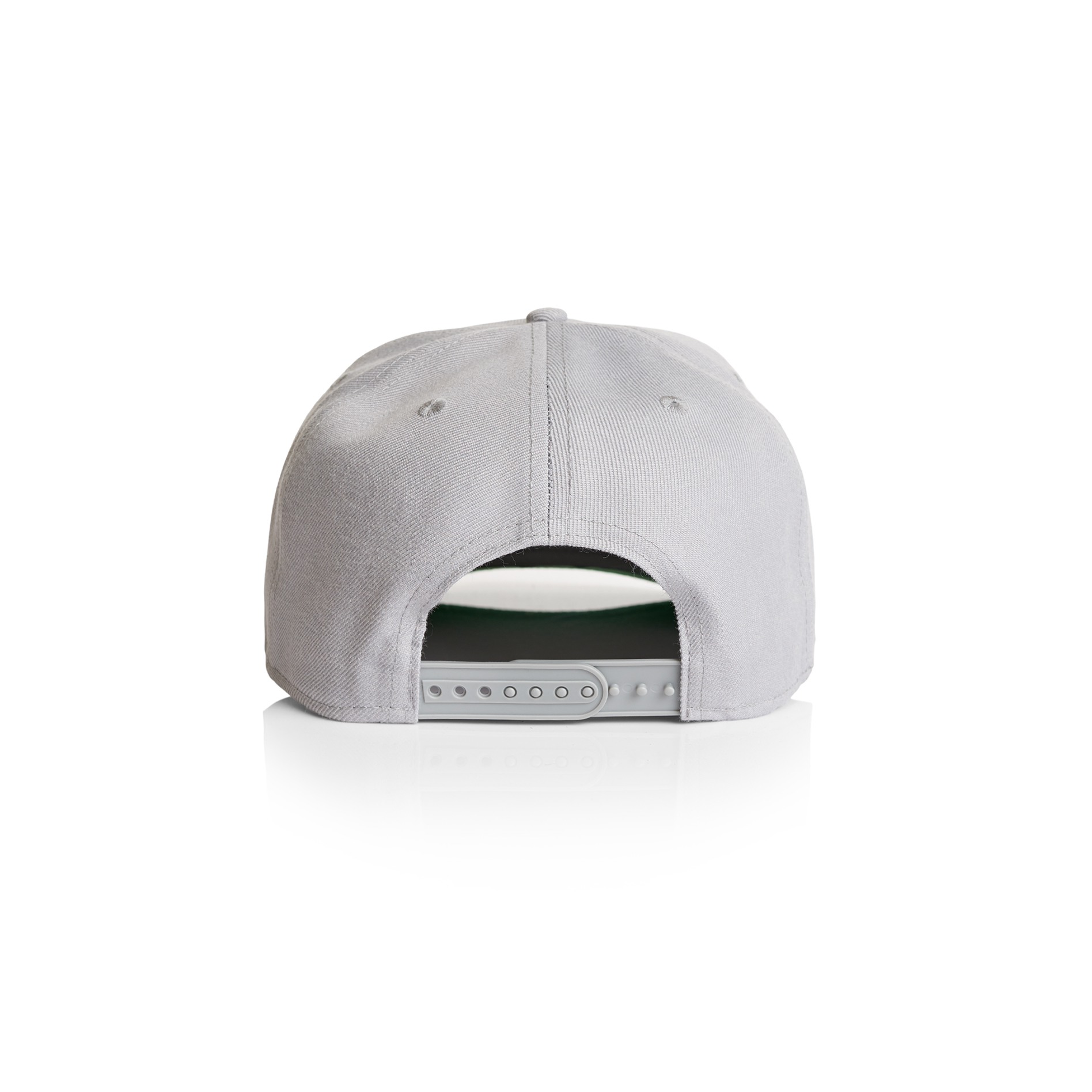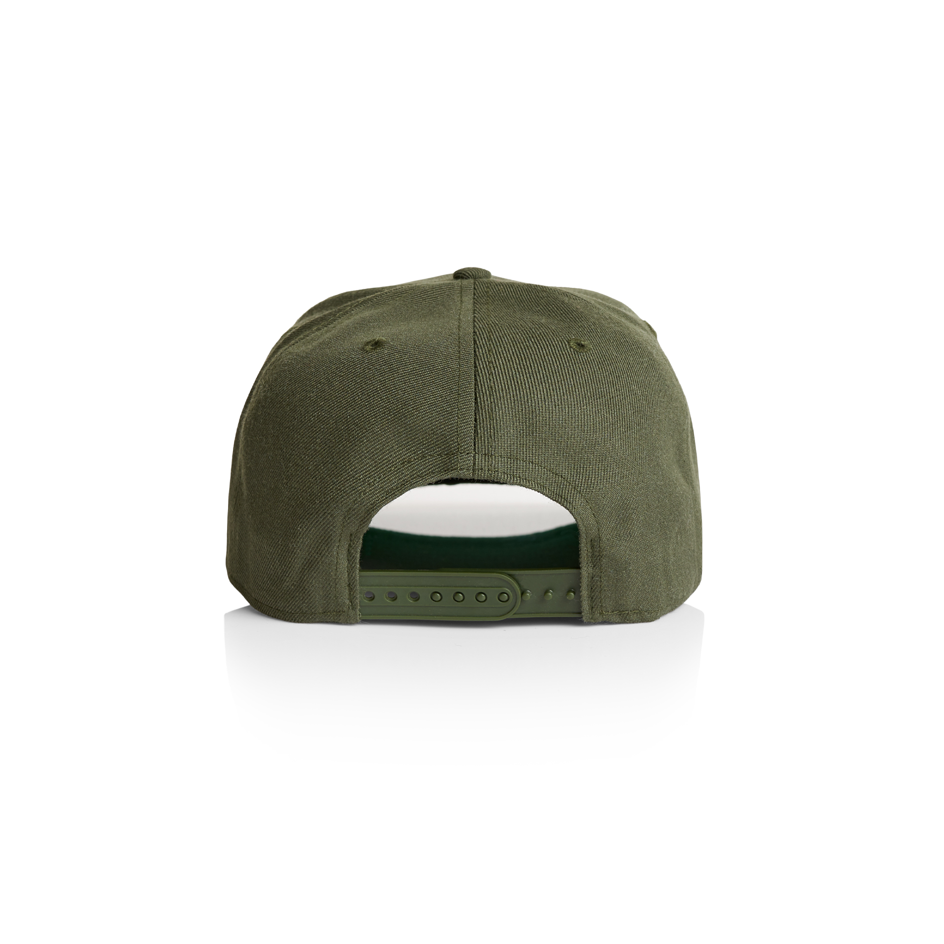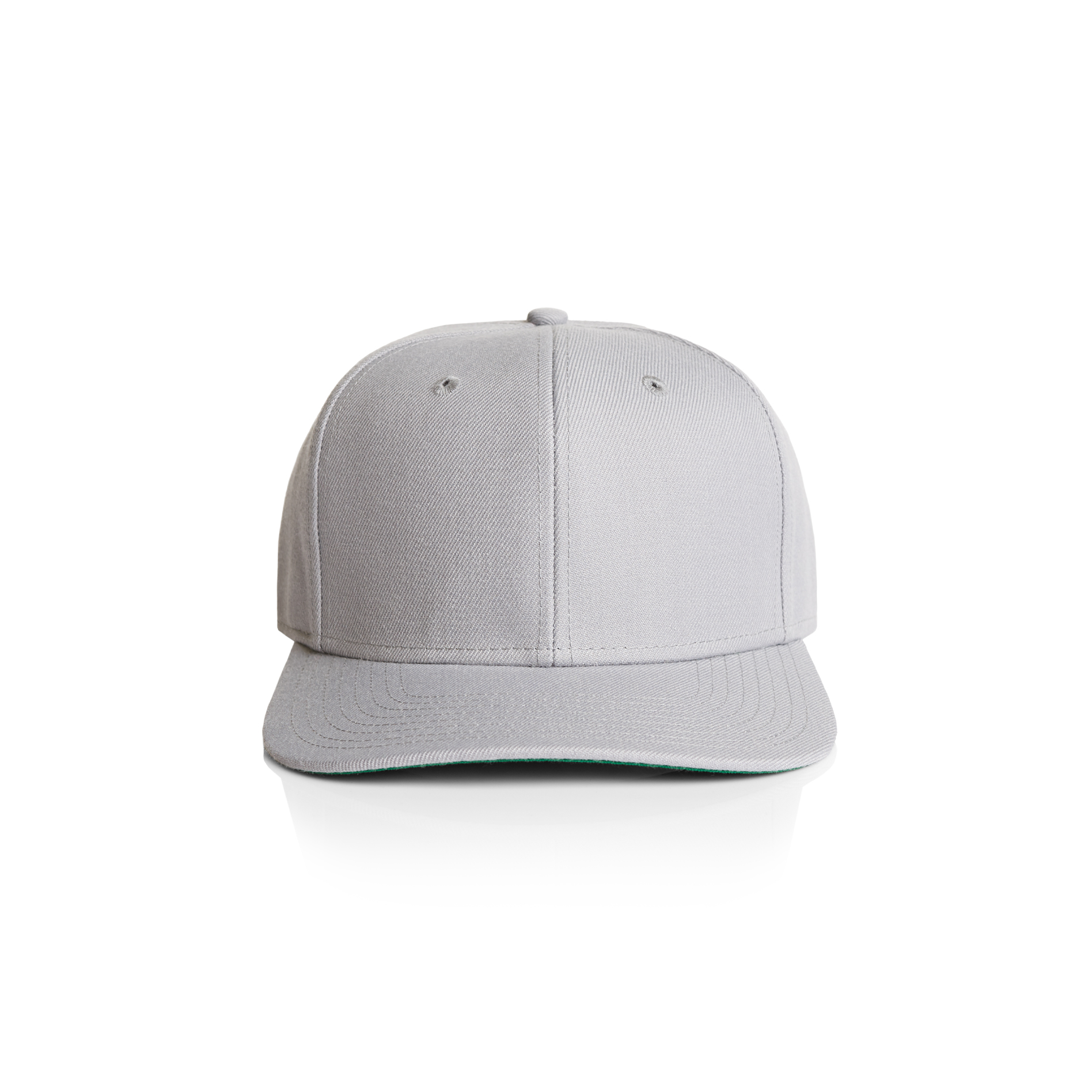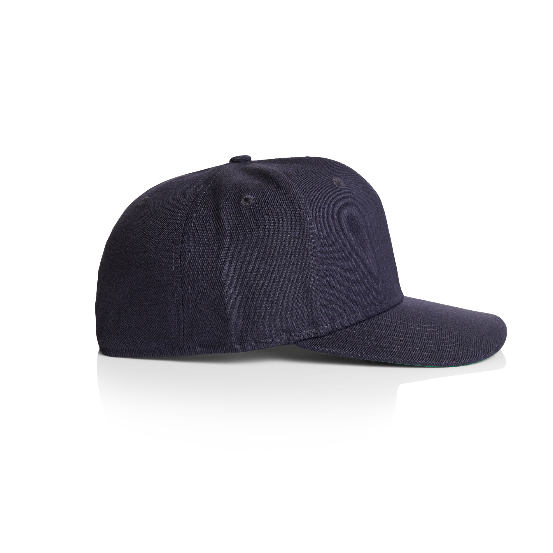 High profile snapback cap, adjustable plastic fastener, eyelets, green under-peak lining, mid weight, 80% acrylic 20% wool