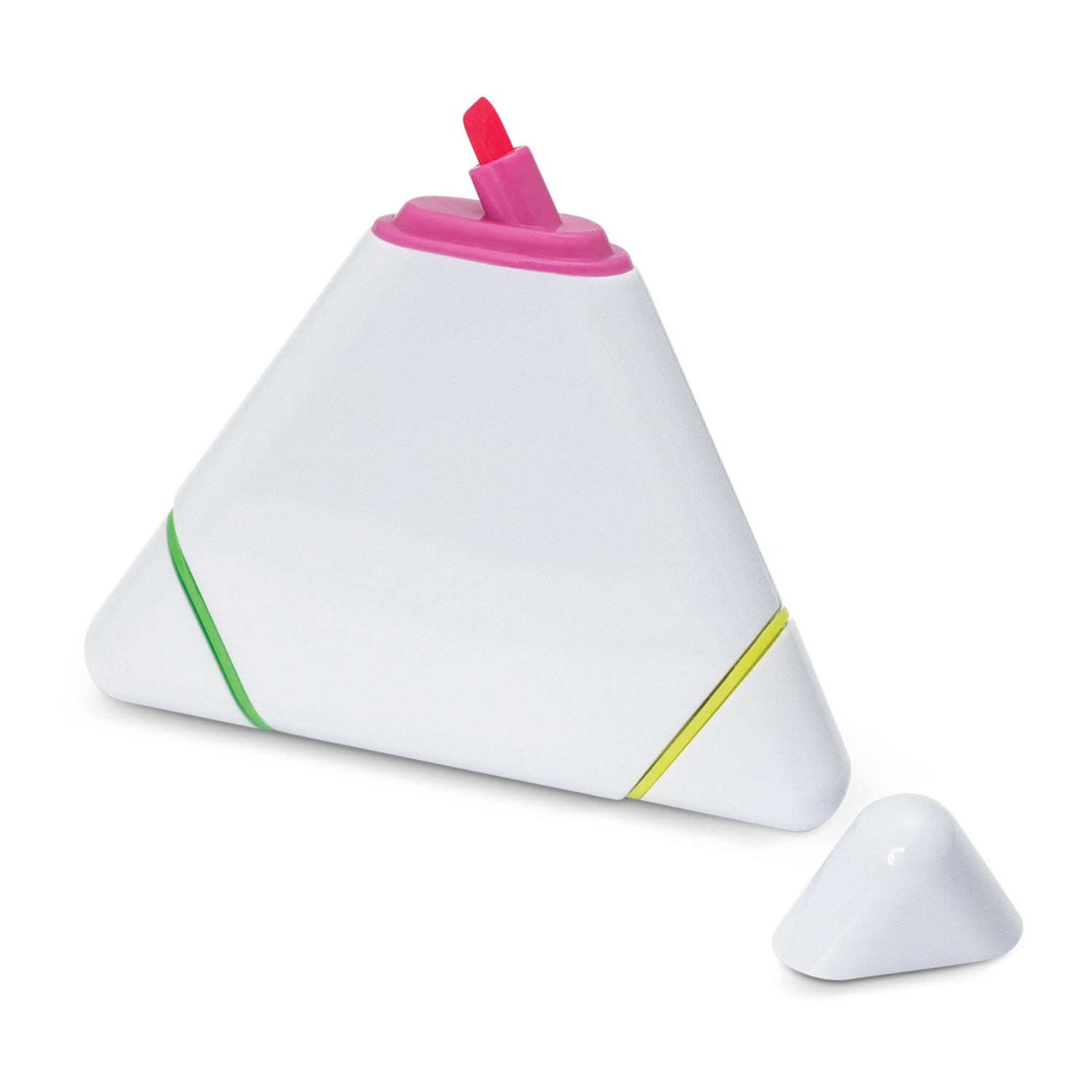 Triangle shaped highlighter set which features yellow, green and pink highlighters. Decoration: Pad Print | Direct Digital