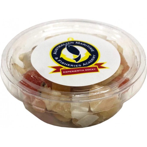 Plastic Tub filled with 30g Dried Fruit Mix Biodegradable plastic if waste is disposed to a commercial composting facility.