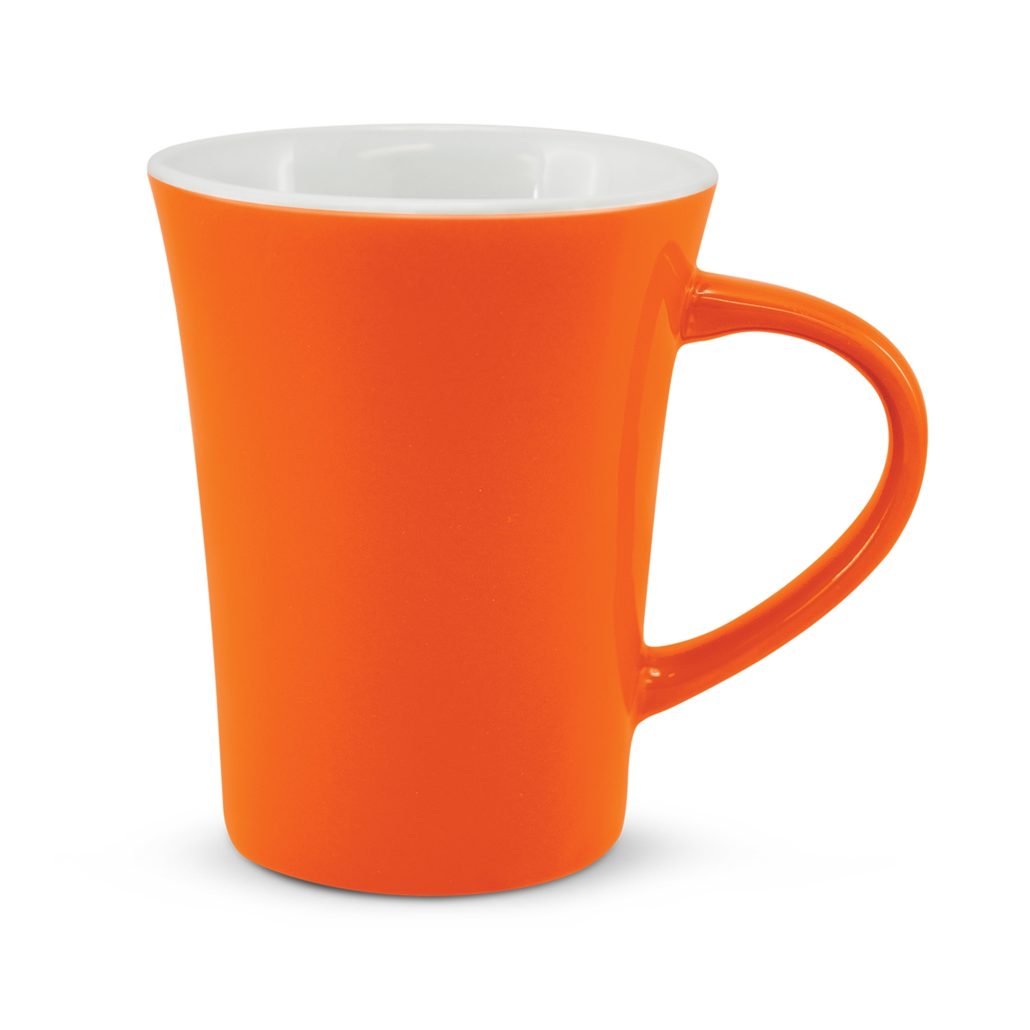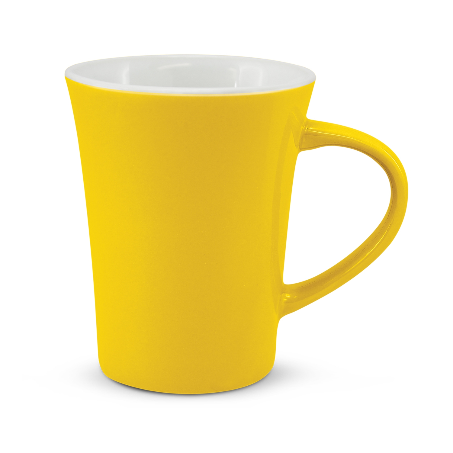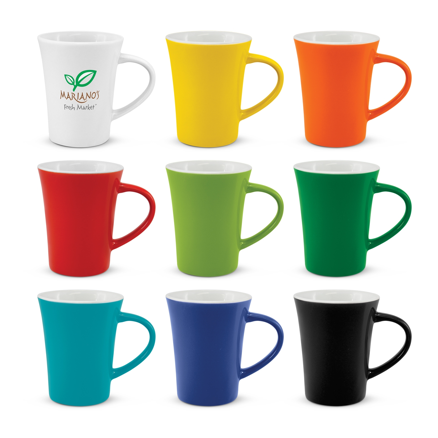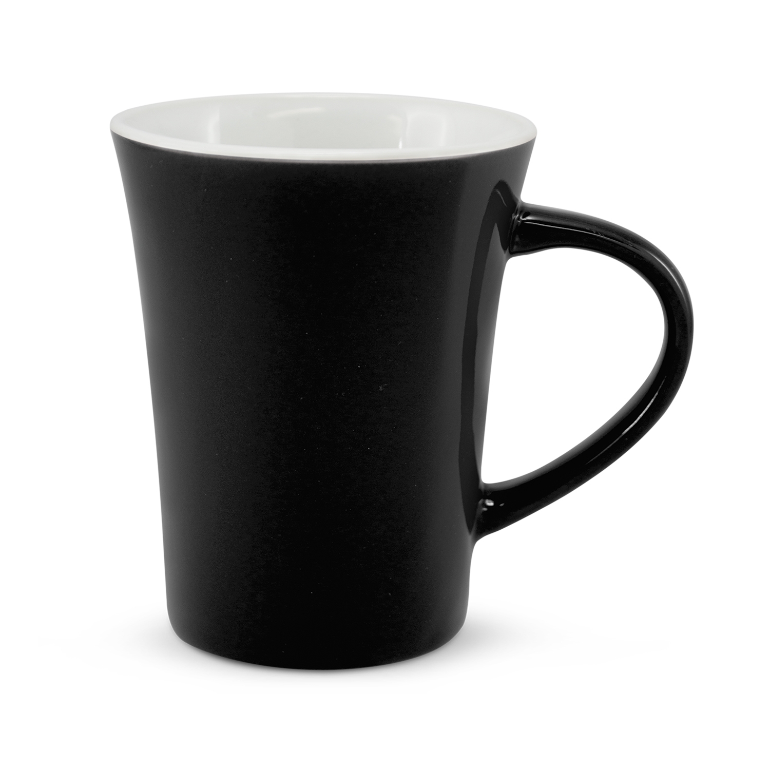 Contoured, 300ml round stoneware coffee mug presented in a black gift box. The inside of the mug is white with a stunning range of bright outer colours and the branding options available are dishwasher safe. Decoration options: Pad Print