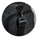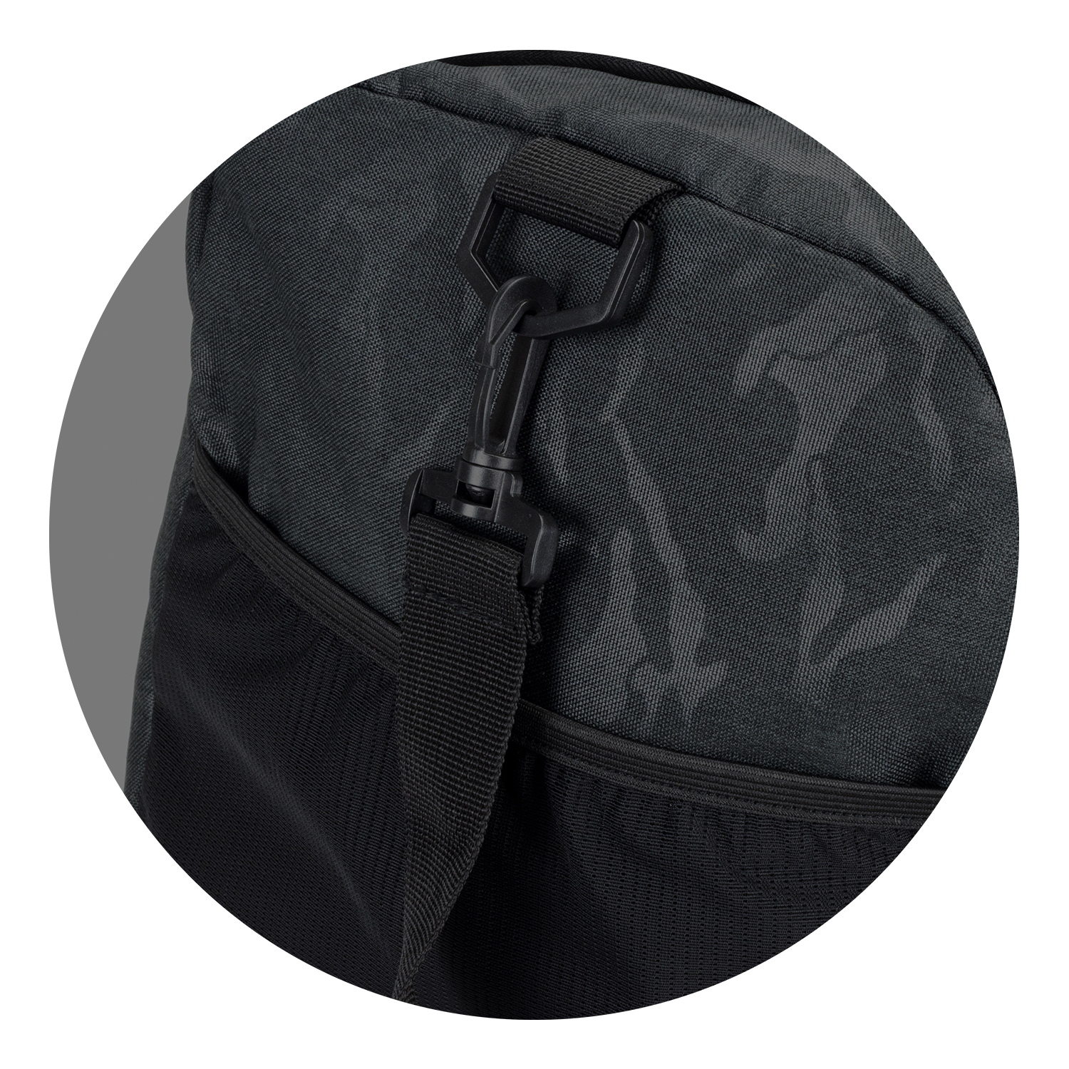 Camouflage duffle manufactured from 300D polyester. It has a sturdy zippered main compartment and front pocket, a slip pocket on one side and a ventilated shoe storage compartment on the other. The duffle has an adjustable shoulder strap and carry handles with a velcro cuff.