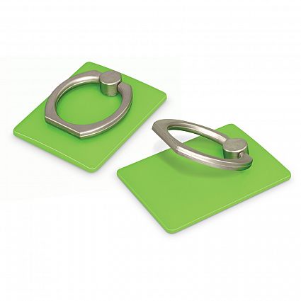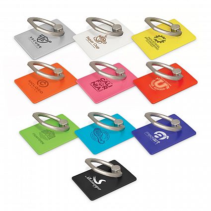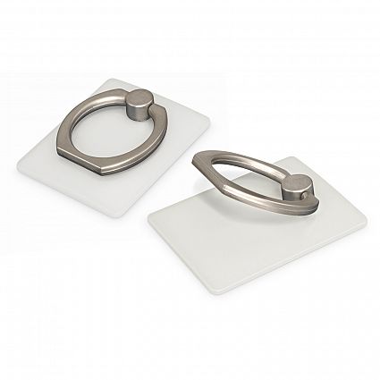 Low profile plastic phone grip which adheres securely to the back of a phone or phone case. It has a metal ring that snaps out to provide a secure finger grip or a handy phone stand.