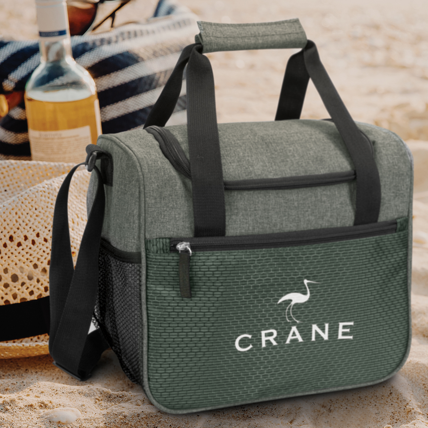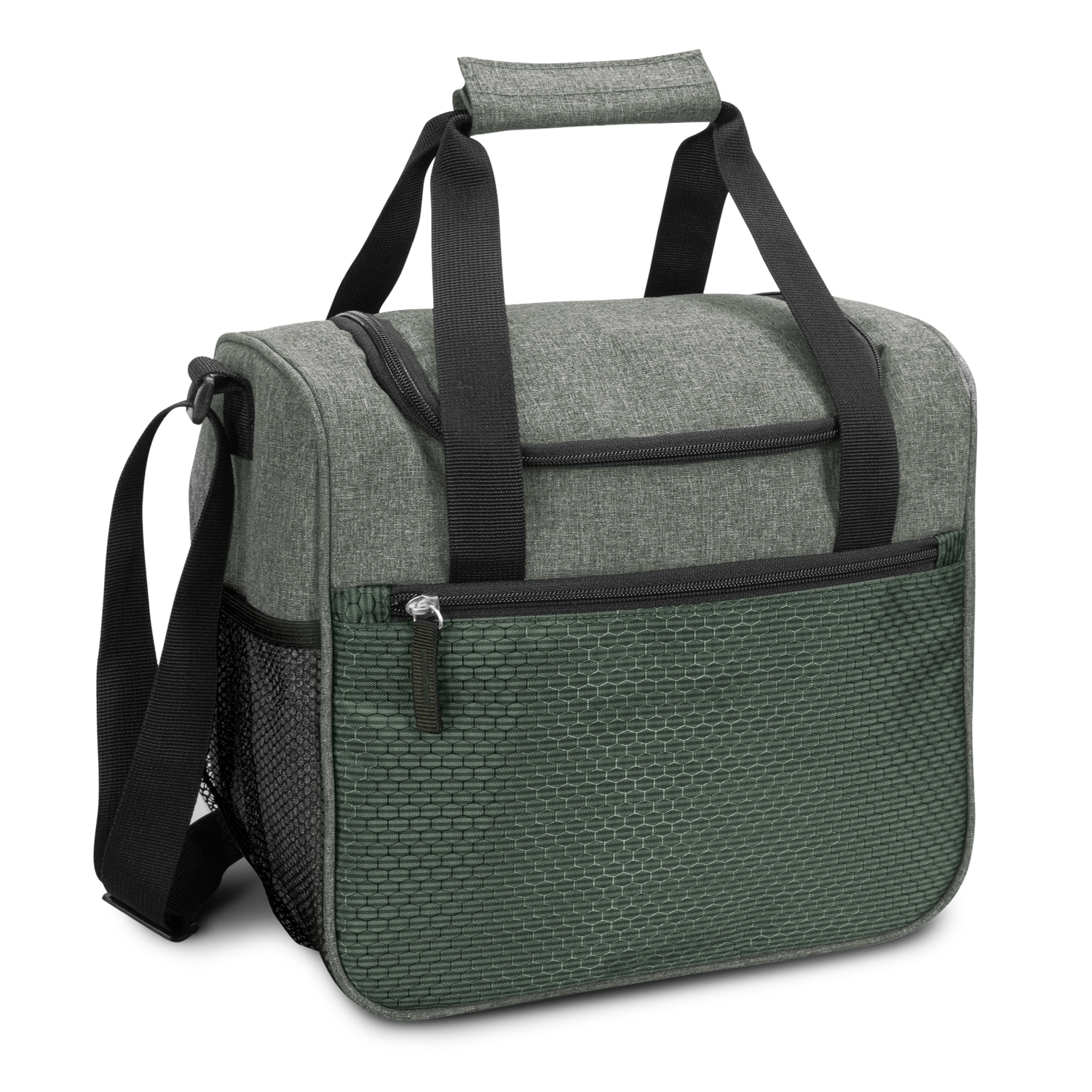 Sophisticated 12L cooler bag with thick PE foam insulation encased in a waterproof PEVA inner liner. The outer construction is a combination of on-trend heather style 300D polyester and 600D polyester. Velocity has a distinctive front pocket with an eye-catching patterned finish and a zippered closure. Other features include a zippered top opening, an adjustable woven shoulder strap, woven carry handles with a Velcro cuff, two mesh side pockets and smart woven zipper pulls.