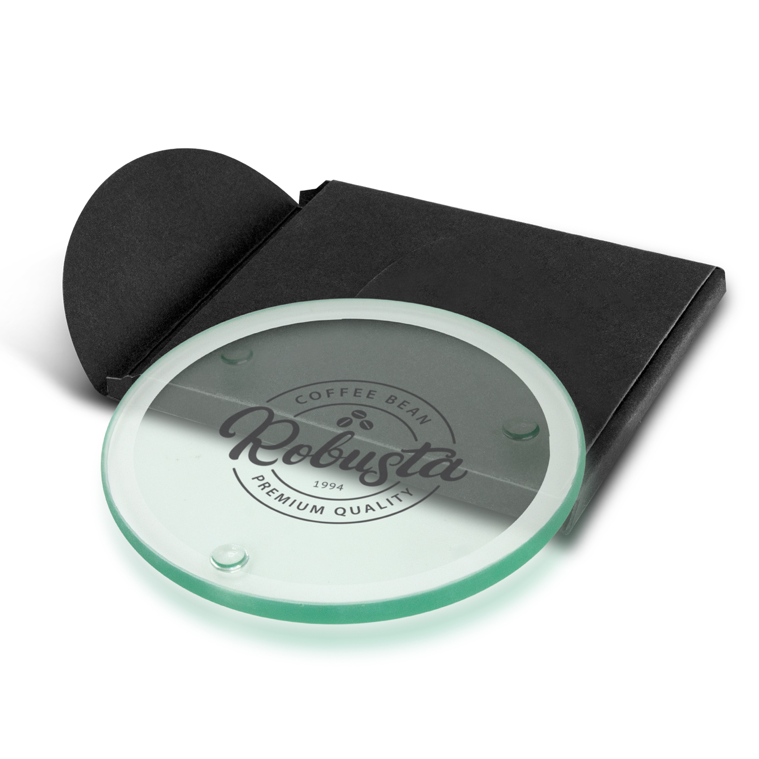 Round glass coaster which is presented in a smart cardboard sleeve. It has three soft non-skid, non-marking polyurethane pads on the base. Handwashing is recommended.