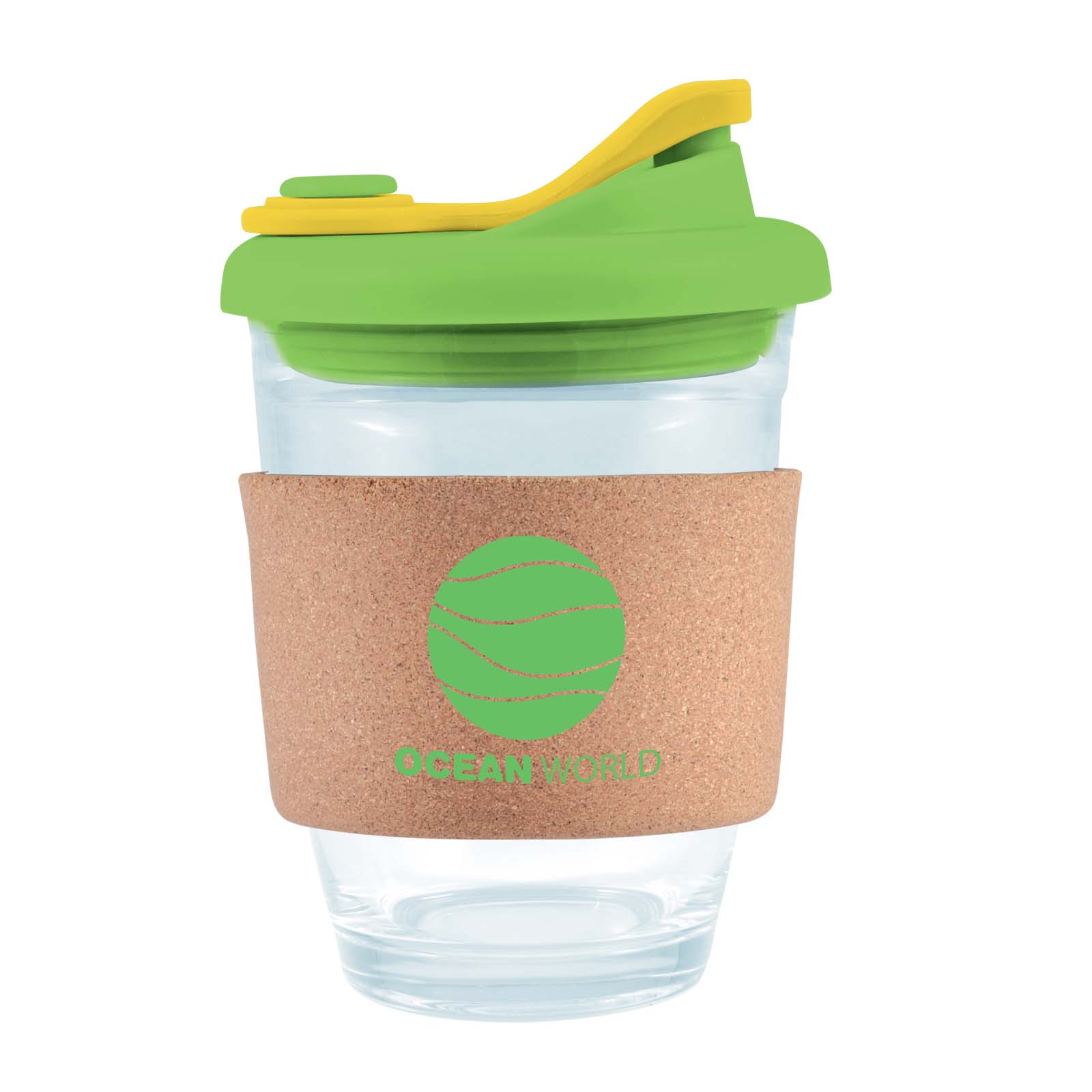 320ml glass reusable coffee cup. Borosilicate glass is known for its durability and thermal shock resistance. Nominate your choice of lid and flip piece colour. Packed in kraft gift box. For logo longevity, hand washing is recommended. Eco Credentials: Reusable, sustainable, printed using renewable energy.