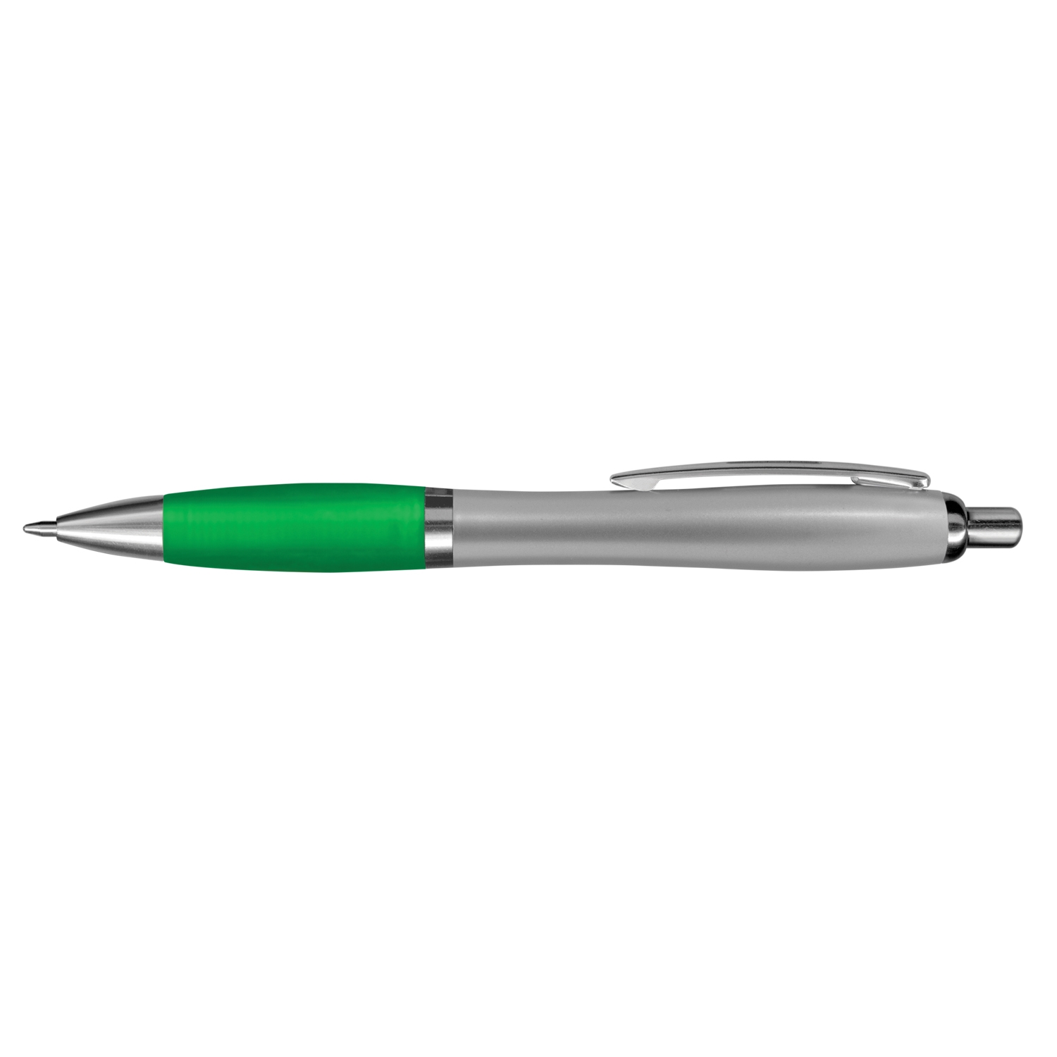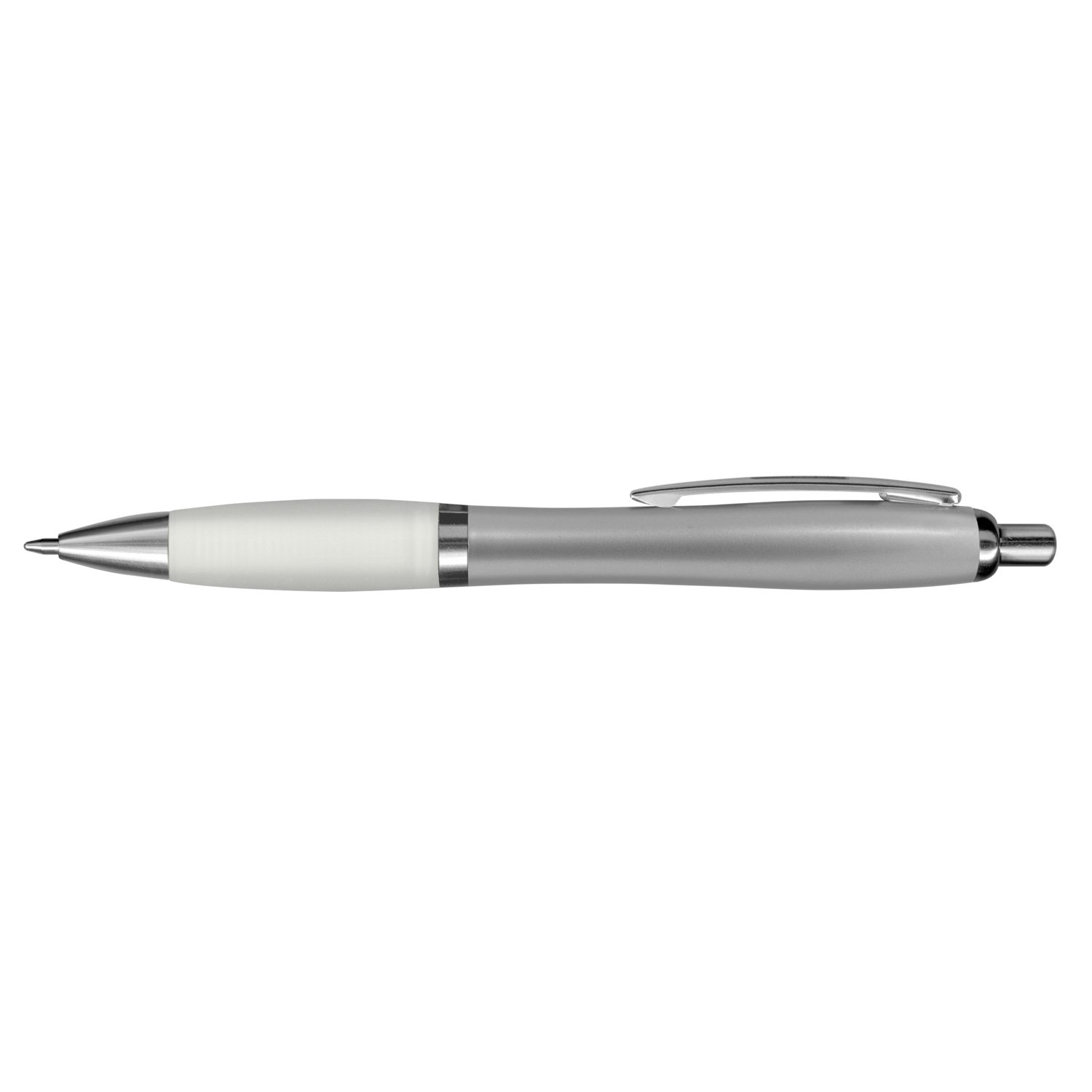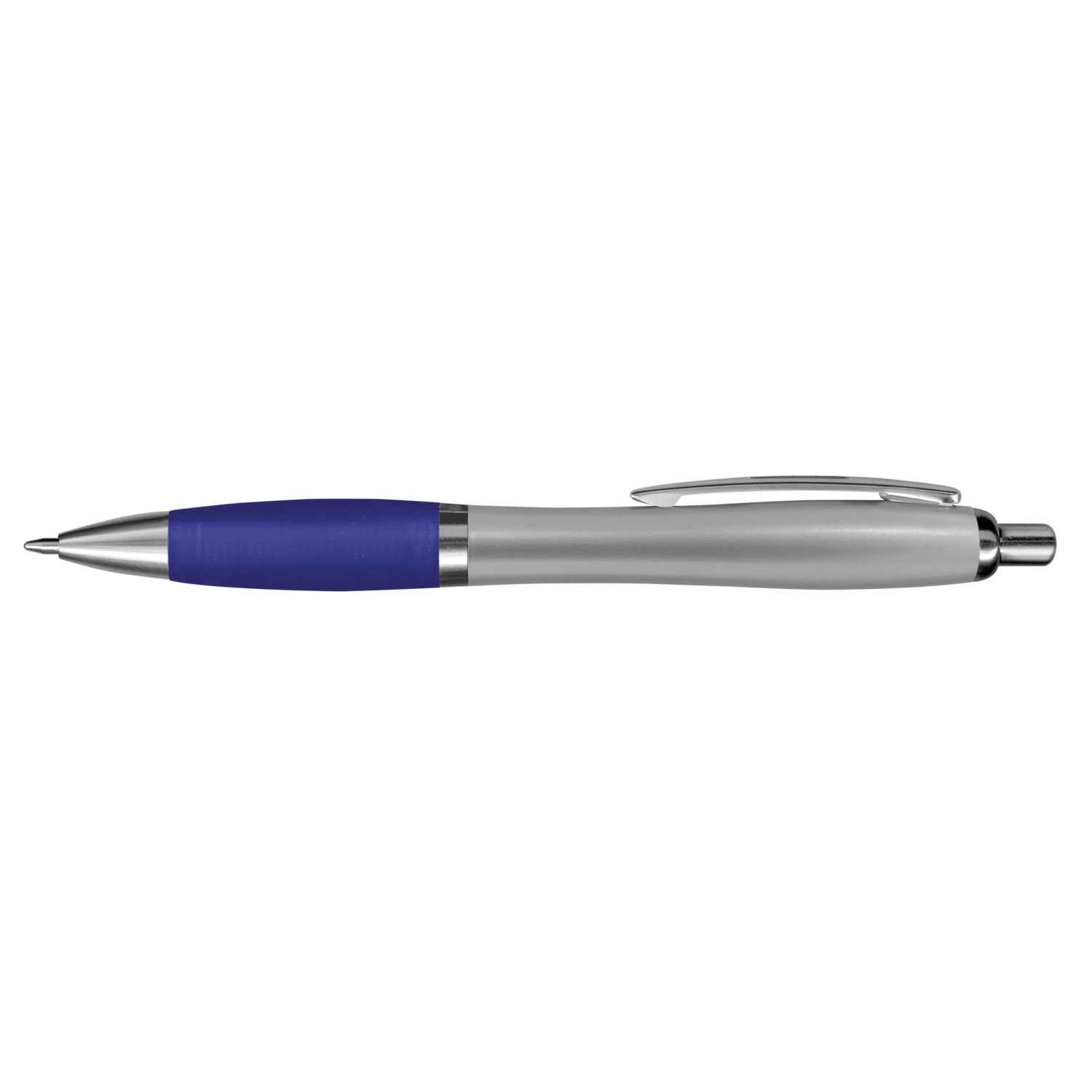 Retractable plastic and metal ball pen with a Silver barrel, a frosted translucent soft touch rubber lacquered grip and shiny Chrome accents. It has a Black ink TRENDS Large Volume refill with 1800 metres of German manufactured DOKUMENTAL ink and a tungsten carbide ball for improved writing quality. Blue ink is available for an additional charge. . Decoration options: Pad Print | Direct Digital